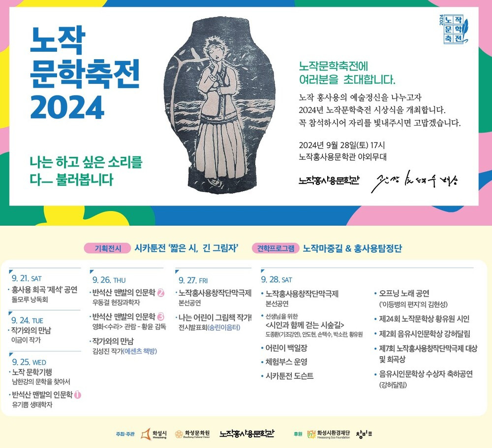 5시부터 진행된 시상식에서는 제24회 노작문학상에 황유원 시인이, 제2회 음유시인문학상에 강허달림 님이, 제7회 창작단막극제 대상 및 희곡상에 <나의 고난은 50분 남았다>가 상을 받았다. 어린이백일장에서는 초등학교 1학년 여학생이 '손'이라는 소재로 대상을 받았고 낭독이 이어졌는데 시 속에 아이다운 생각이 잘 표현되어 있어 듣는 사람들 모두를 감탄케 했다.