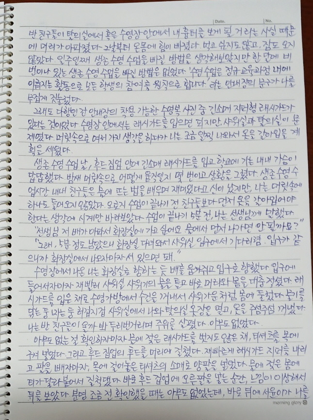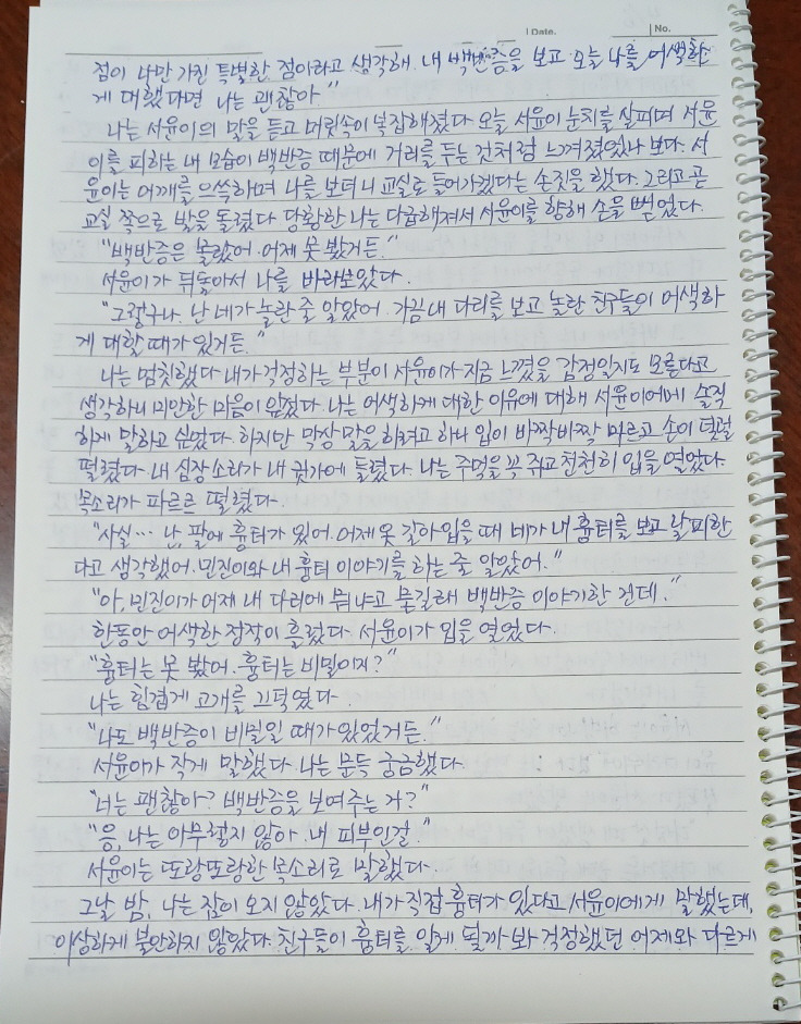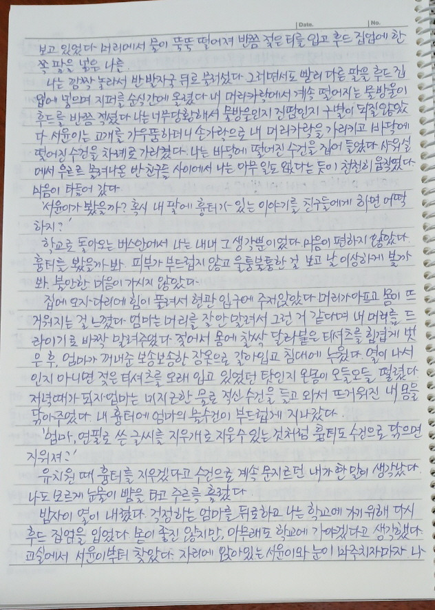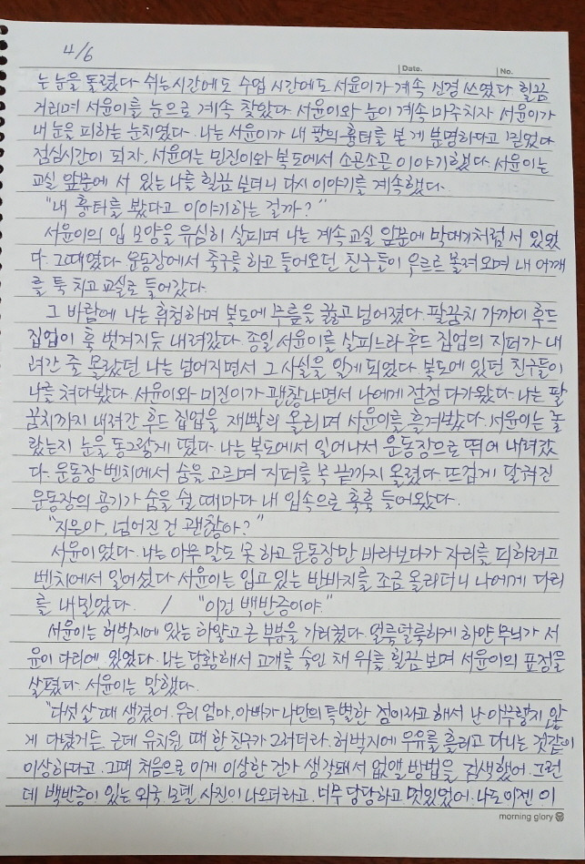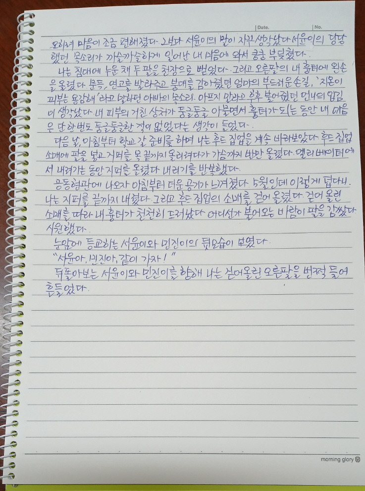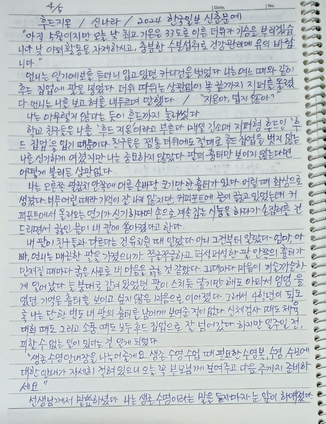 스물아홉 번째 마지막 필사는 2024 한국일보 신춘문예 <후드 지온>이다. 팔꿈치에 화상 상처가 있는 지온은 한여름에도 항상 후드 집업을 입고 다닌다. 상처를 알게 되면 친구들이 자신을 놀릴까 봐 전전긍긍한다. 그러다 생존 수영 수업이 있다는 걸 알게 되고 지온은 후드 집업 밑에 긴소매 지퍼형 래시가드를 입고 수영장에 갔다가 끝나기 5분 전에 미리 나와 옷을 갈아입는다는 전략을 세우지만 옷을 미처 다 갈아입기 전에 친구 서윤이와 마주치고 만다. 지온이는 서윤이가 자신의 상처를 봤다고 생각하고 서윤이 눈치를 본다. 하지만 서윤이는 자신의 다리에 있는 백반증을 보여준다. 친구들에게 보여주는 게 괜찮냐는 물음에 서윤이는 내 피부니까 괜찮다는 대답을 한다. 지온이는 밤새 이런저런 생각을 하다 아침에 후드 집업의 소매를 걷어올리고 친구들을 만난다.