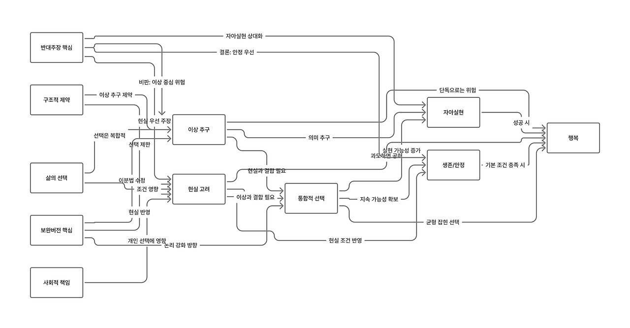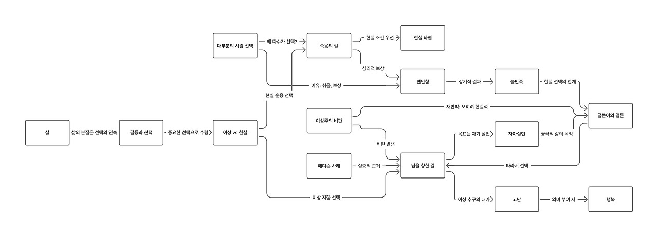 - 비판하는 부분을 표시한다. (예시.이분법(과도한 단순화)의 문제, 죽음의 길’이라는 표현은 강력한 가치 판단, 자아실현 = 삶의 궁극 목적?, 에디슨 사례의 오류, 현실 선택에 대한 왜곡, 고난의 미화, 사회적 맥락의 결여)