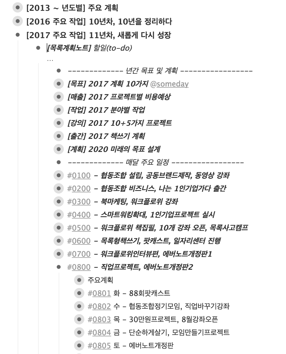 나의 경우는 워크플로위(workflowy)에 하루 계획을 작성한 지가 1년이 넘었다. 일정관리 앱 등으로 사용했던 것과 달리 모든 것을 작성했다. 작업 방식은 아침에 읽어 나서 아침 일기, 운동일지(2주 전부터, 몸무게와 해야 할 운동), 당일 해야 할 일들을 순서 없이 작성해 내려간다.