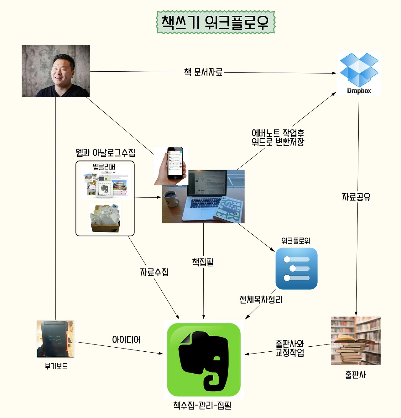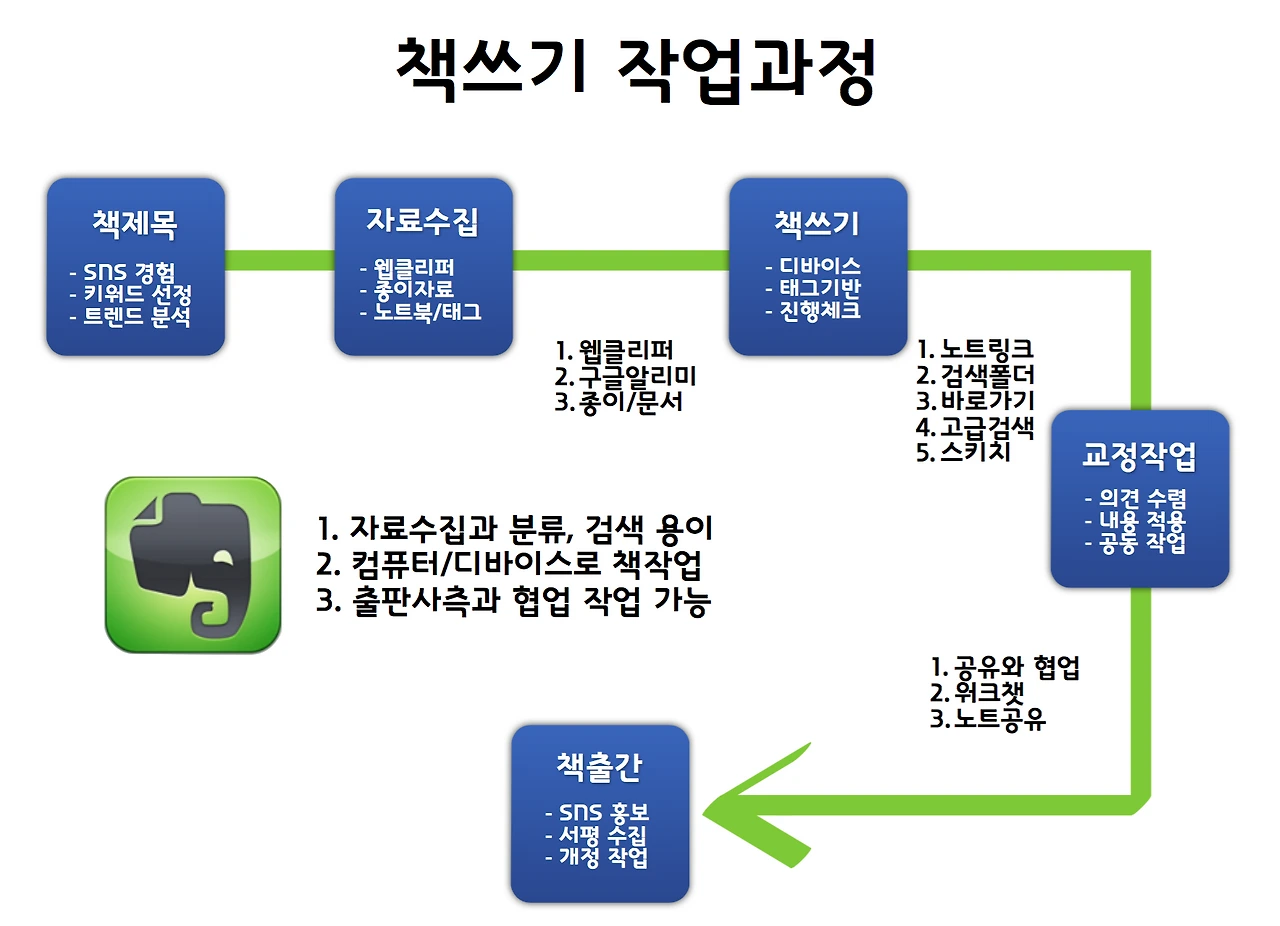 (1)동일한 집필환경 마련하기 위해서 에버노트를 사용했으며, 덕분에 자료수집과 관리, 책 쓰기 작업을 한 곳에서 진행이 가능하다. 이는 출판사와 교정작업 시 협업 작업을 구축했다.
