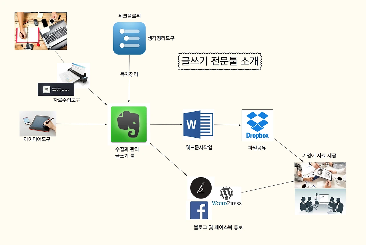 1인 기업으로 9년 동안 6권의 책(총 7권)을 쓰면서 얻은 경험은 나에게 맞는 최적의 글쓰기 도구를 만들었다. 최근 집필한 '프로들의 에버노트'책 작업 환경에서 적용했던 방식이며, 어떻게 작업했는지 글쓰기 작업환경(워크플로우)을 작성했다.