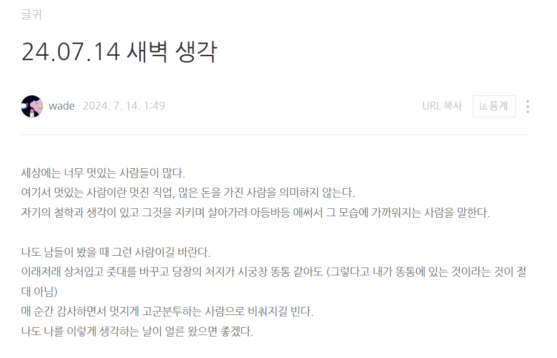 맞아요. 저는 계속해서 나아가고 싶은 사람이에요. 어색한 감정을 쓰겠다고 생각한 이유도 그래요. 지금의 나보다 내일은 더 괜찮은 나를 마주하고 싶거든요. 어제 새벽 감성에 젖어 (...) 블로그에 쓴 글도 비슷하답니다..!