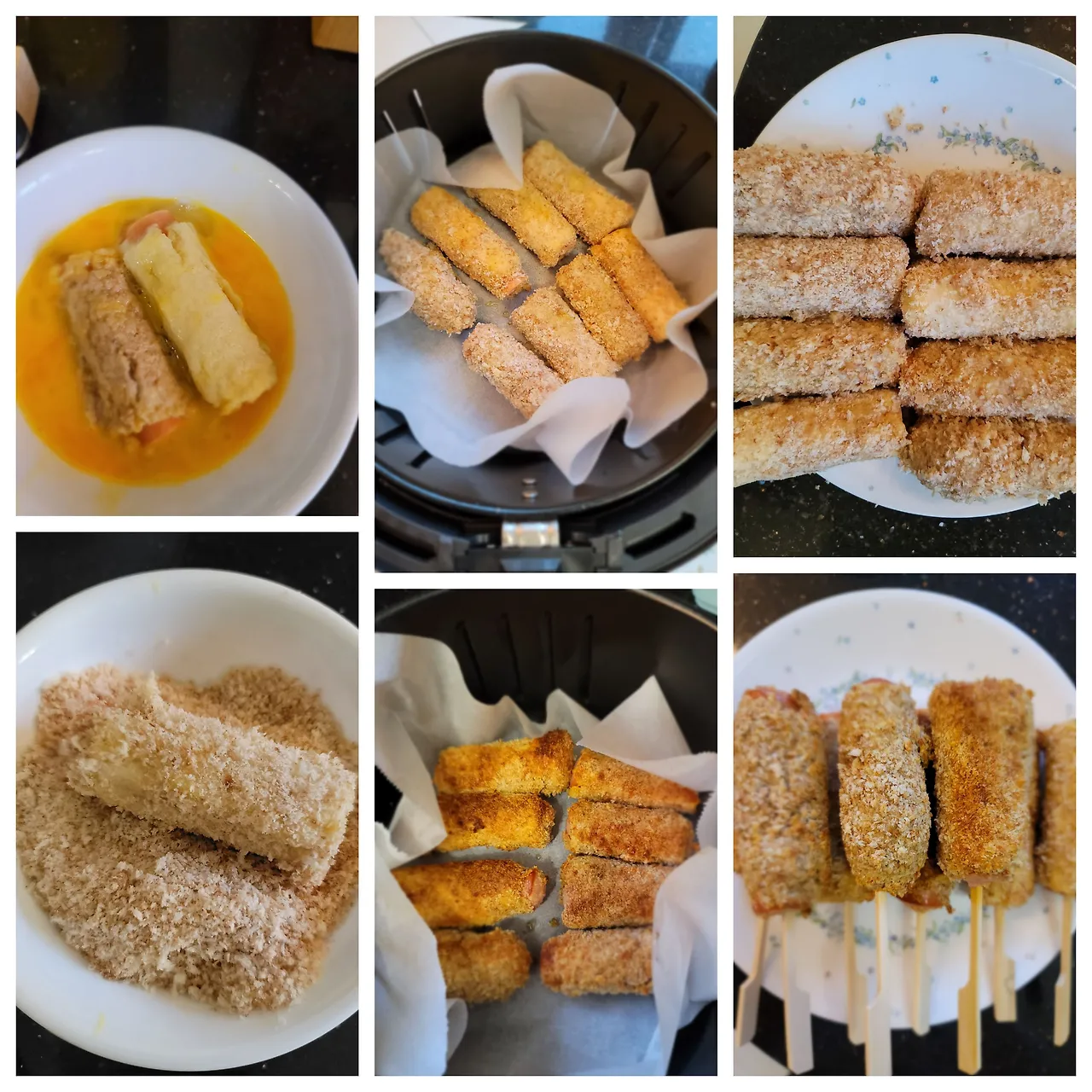 계란옷을 입히고 만든 빵가루를 돌돌 말아 에어 프라이기 돌리면 된다. 나무 꼬지까지 있으면 완전 핫도그이다. 학교를 갔다 온 아이들이 집에 와서 맛있는 냄새가 난다고 너무 좋아했다. 그 이후 자신감을 얻어 고구마도 쪄보고 굽네치킨, 목살 구이까지 만들어먹었다.