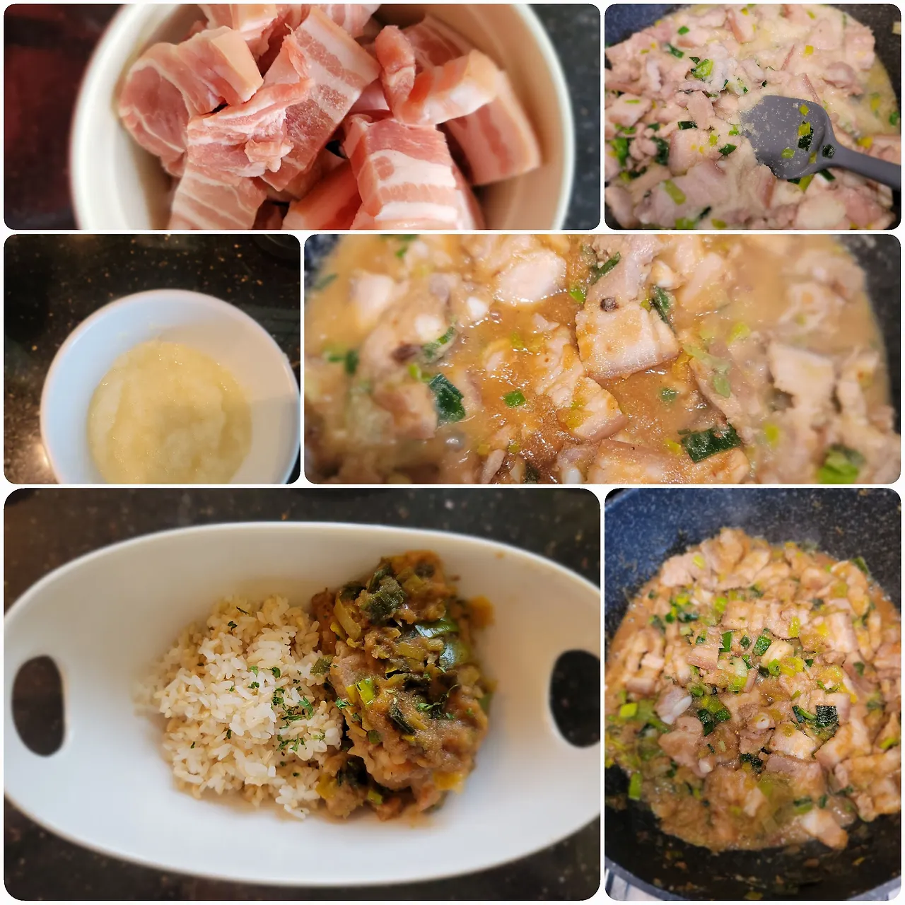 삼겹살을 잘라 마늘과 파로 달달 볶아 간 양파를 넣어 계속 볶는다. 그러다 약간의 된장과 간장, 꿀 등을 넣어 달달 볶으면 맛있는 삼겹살 요리가 된다. 달달 볶는 냄새에 아이들은 맛있는 냄새가 난다며 부엌으로 달려온다. 그리고 밥에 비벼 한 그릇을 뚝딱 먹는다. 나도 오랜만에 먹어보고 싶던 맛의 고기를 먹으니 기분이 좋았다.