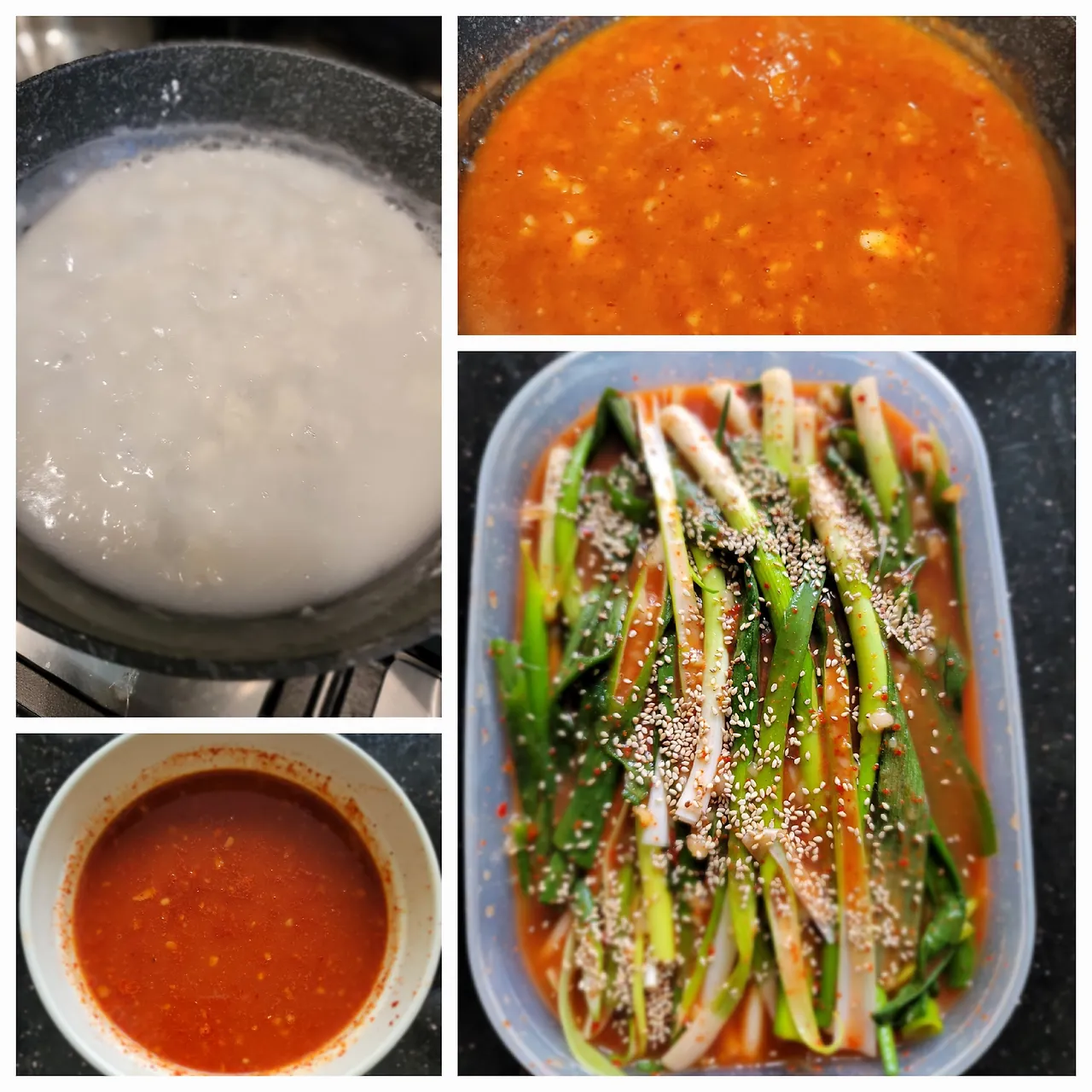 찹쌀가루를 사놓은 게 있어 풀을 쑤고 고춧가루, 생강, 꿀, 액젓을 넣어 양념을 만들었다. 내가 영상을 시청한 음식 고수님은 파김치에 마늘은 안 넣는 게 좋다고 하셔서 안 넣고 생강만 넣었다. 풀물이 조금 잘 못 쒀지긴 했지만 우선 양념장 맛이 좋았다. 역시 멸치액젓이 들어가야 한다. 양념장이 식은 다음 파에 부으니 제법 그럴듯한 파김치가 완성되었다. 이제 잘 익으면 끝이다. 맛있으면 좋겠다.