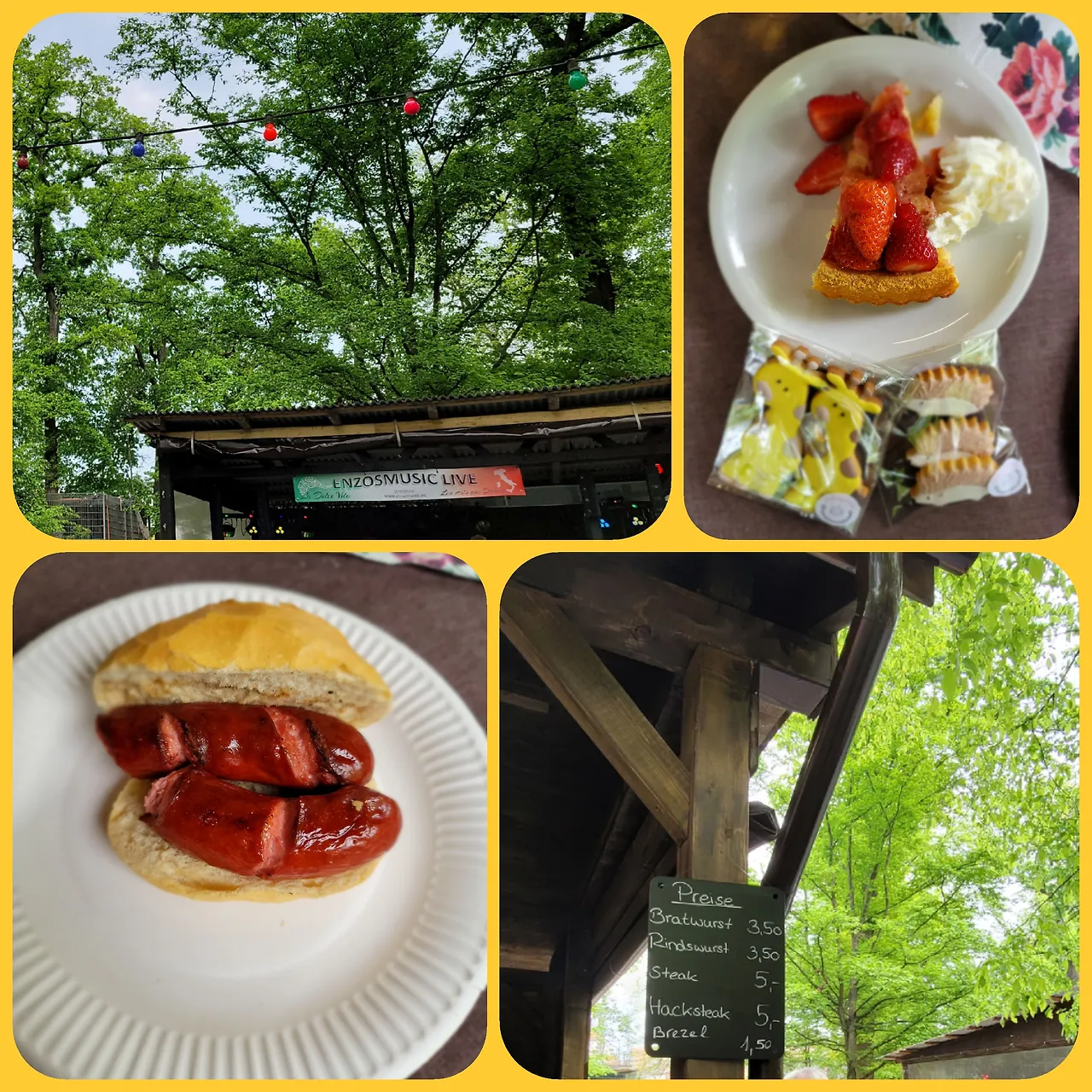 우리는 자전거를 세워두는 곳에 세우고 동물원 안으로 들어갔다. 입장료는 무료였다. 사람들을 따라 안으로 들어가 동물을 조금 보다 보면 소시지, 스테이크, 맥주, 케이크, 쿠키 등을 파는 간이음식점들이 있었다. 노랫소리도 들렸다. 실시간 라이브로 독일 할아버지와 독일 할머니가 빨간 잠바를 입고 노래를 부르시고 사람들은 음식을 먹으며 구경을 했다. 독일 할아버지가 노래를 너무 잘 부르셨다. 동물원이지만 동물원 같지 않는 분위기였다. 신기했다.