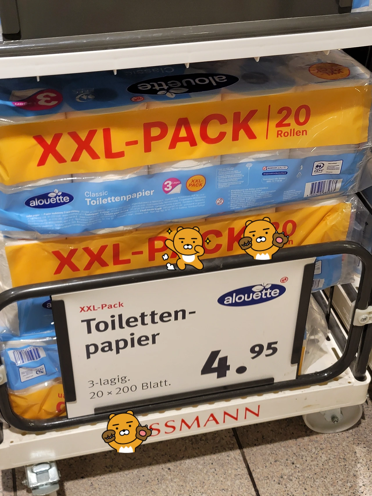 내가 작년 10월 독일에 처음 오고 나서 휴지를 사려고 보니 한국보다 많이 비싸 독일 마트 공부도 할 겸 우리 동네의 여러 마트를 돌며 휴지 가격을 조사하러 다닌 적이 있었다. 지금 생각해보면 이렇게 까지 해야 했나 싶지만 동네 지리를 확실히 파악할 수 있었으며 독일 마트에 쉽게 적응할 수 있었다.