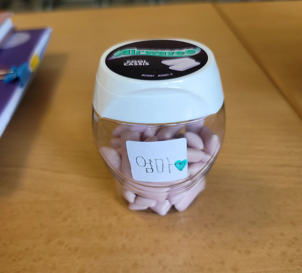 그리고 그다음 날인 지난주 금요일, 나는 학원에 도착해서 책을 빼려고 가방을 여는데 껌통이 하나 들어있었다. 이 껌통은 큰 애 방에 있던 껌통이었다. 나는 큰 애 방에 껌통에서 껌이 맛있다고 하나씩 뺏어 먹었었다. 근데 그 껌통에 엄마하고 하트가 붙어져 있었다. 항상 나에게 큰 애와 둘째는 격려의 선물을 많이 준다. 돈 주고 살 수 없는 그림을 그려서 준다. 이 껌통도 나를 격려하는 큰 애의 선물이었을 것이다.