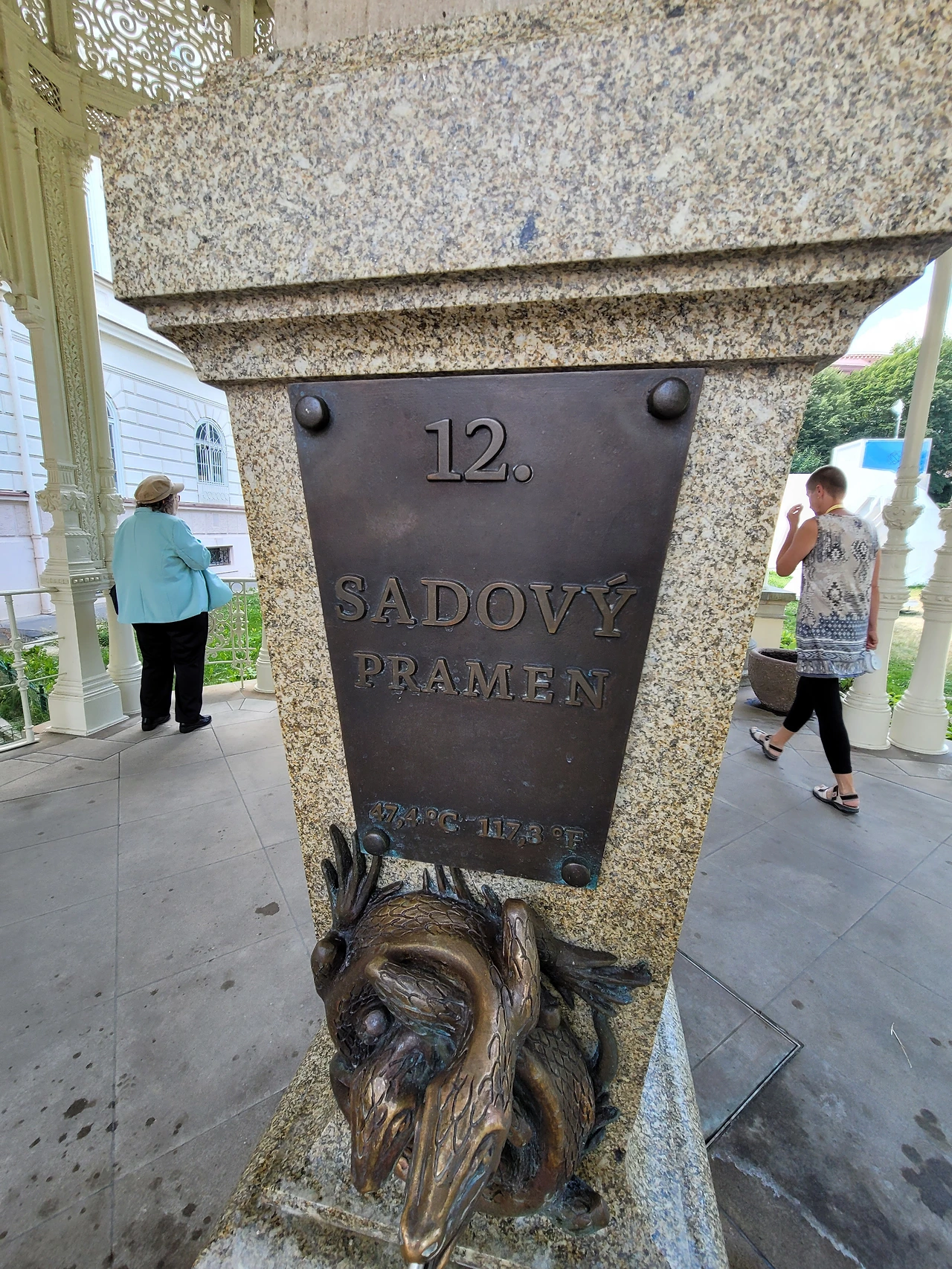 카를로비바리에도 동상들이 많이 세워져 있다. 많은 상점에서 손잡이가 딸린 컵을 팔고 있다. 우리도 남편과 아이들이 구입을 했다. 길거리에서도 물이 나오고 물마다 온도가 나와있다. 온도가 다 다르다. 여기서 물이 계속 나오고 있다. 물의 온도가 높을수록 쇠맛이 많이 난 이유가 여기에 있을 거 같았다.