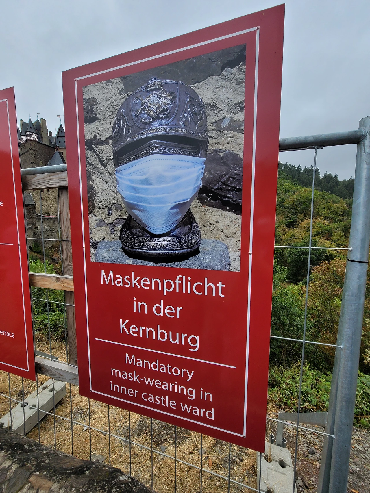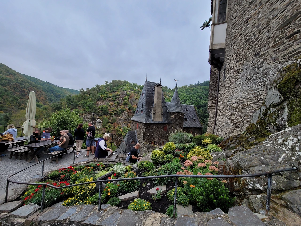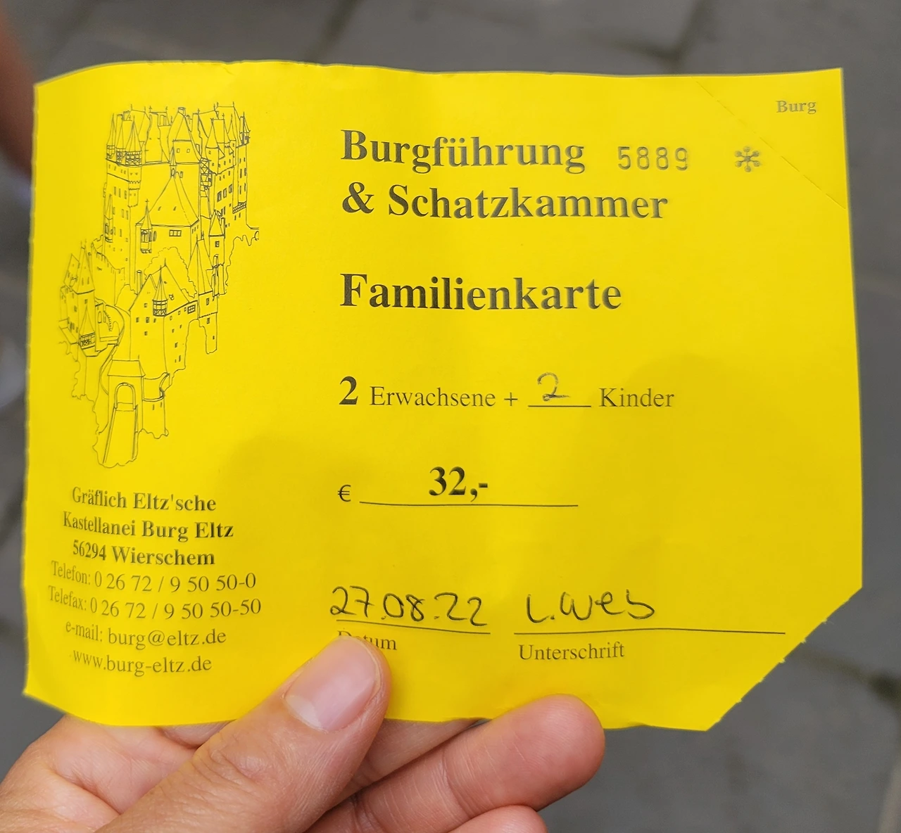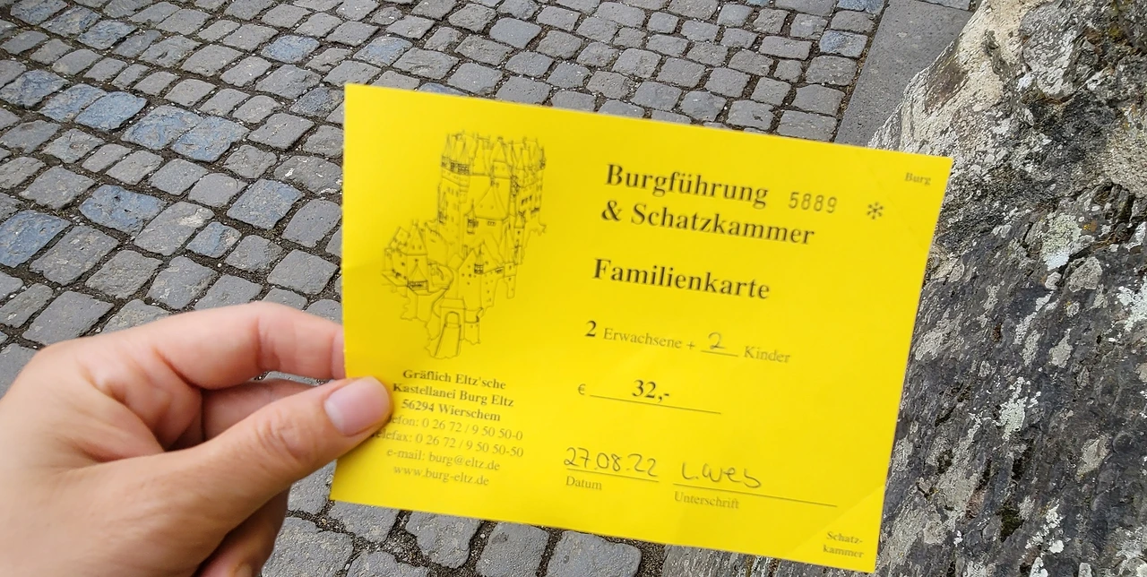 이미 많은 사람들이 엘츠 성에 도착하여 사진 명소에서 사진을 찍고 있었다. 마스크를 반드시 쓰라는 안내문이 있었다. 우리는 가족표를 끊어 들어갔다. 가족표는 어른이 2명이고 아이들은 2명 이상부터 살 수 있는데 아이들이 3명이어도 32유로이다. 우리같이 가족단위로 나올 때는 가족티켓이 조금 더 저렴하다.