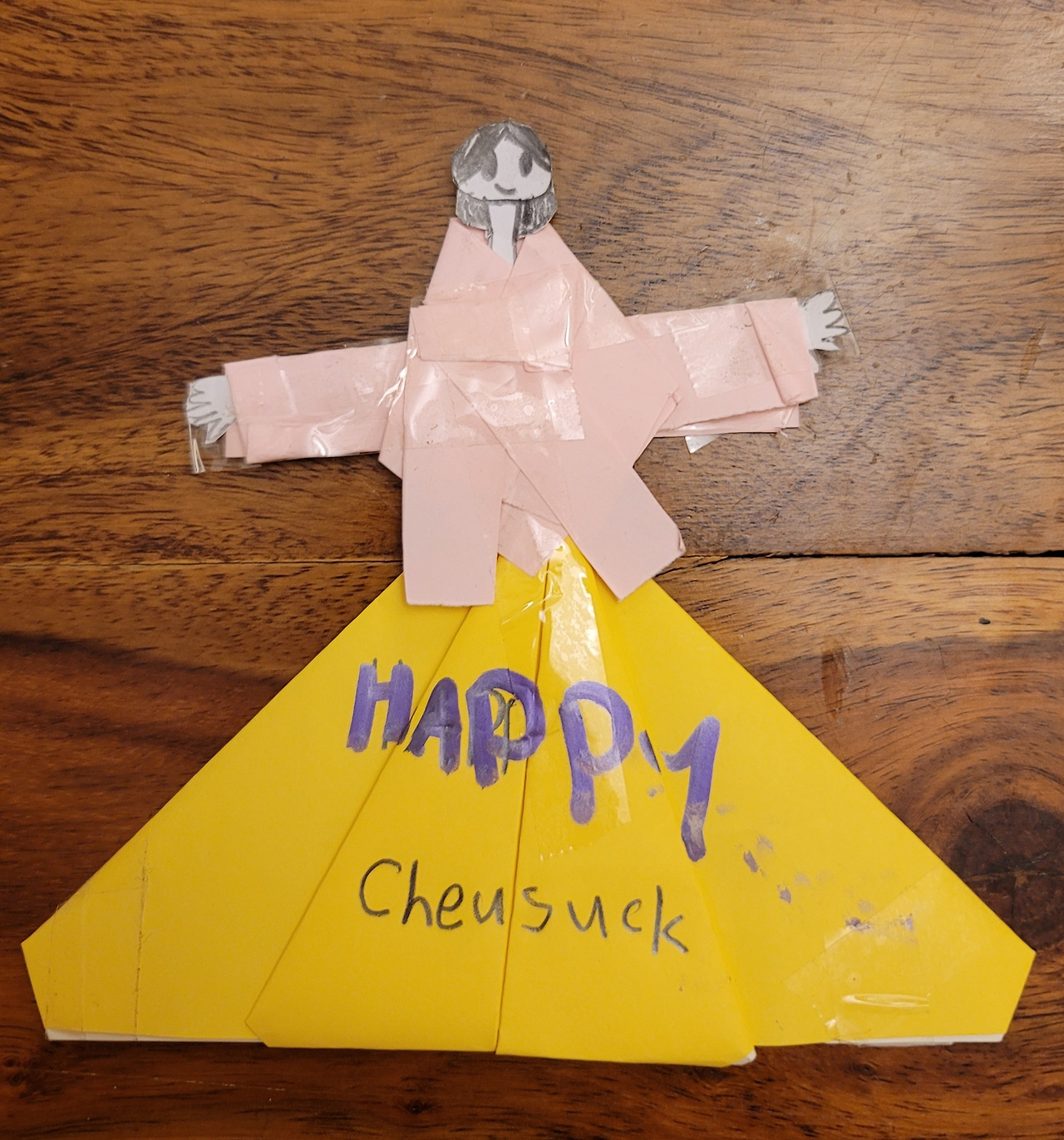 아래 사진은 어제 둘째가 추석에는 종이접기를 해야 한다며 열심히 유튜브를 보고 접은 한복인형이다. 나에게 주는 추석 선물이란다.