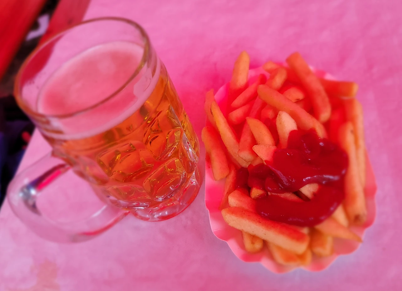 처음에는 마을 입구에서 여기서 축제가 끝나나 했는데 집마다 연결되어 있는 등을 따라가다 보니 소시지도 팔고 감자튀김도 파는 곳이 나왔다. 동네 사람들로 보이는 사람들이 모여 맥주와 감자튀김을 먹으며 이야기를 나누고 있었다. 우리도 자리에 앉아 음식을 주문해서 먹었다.