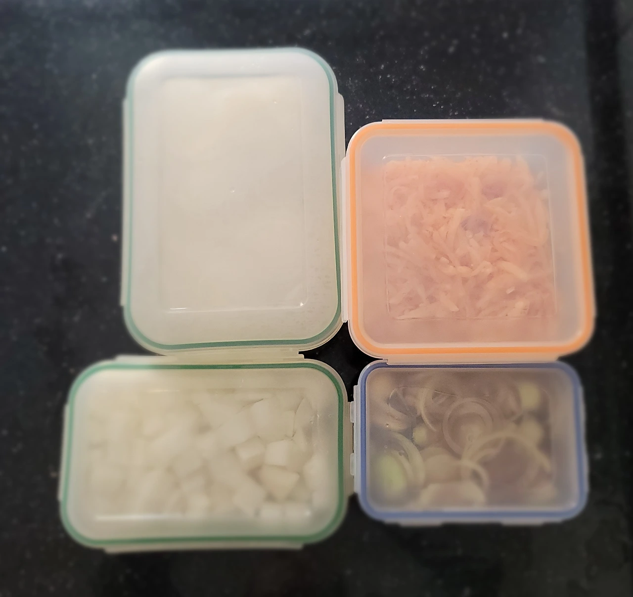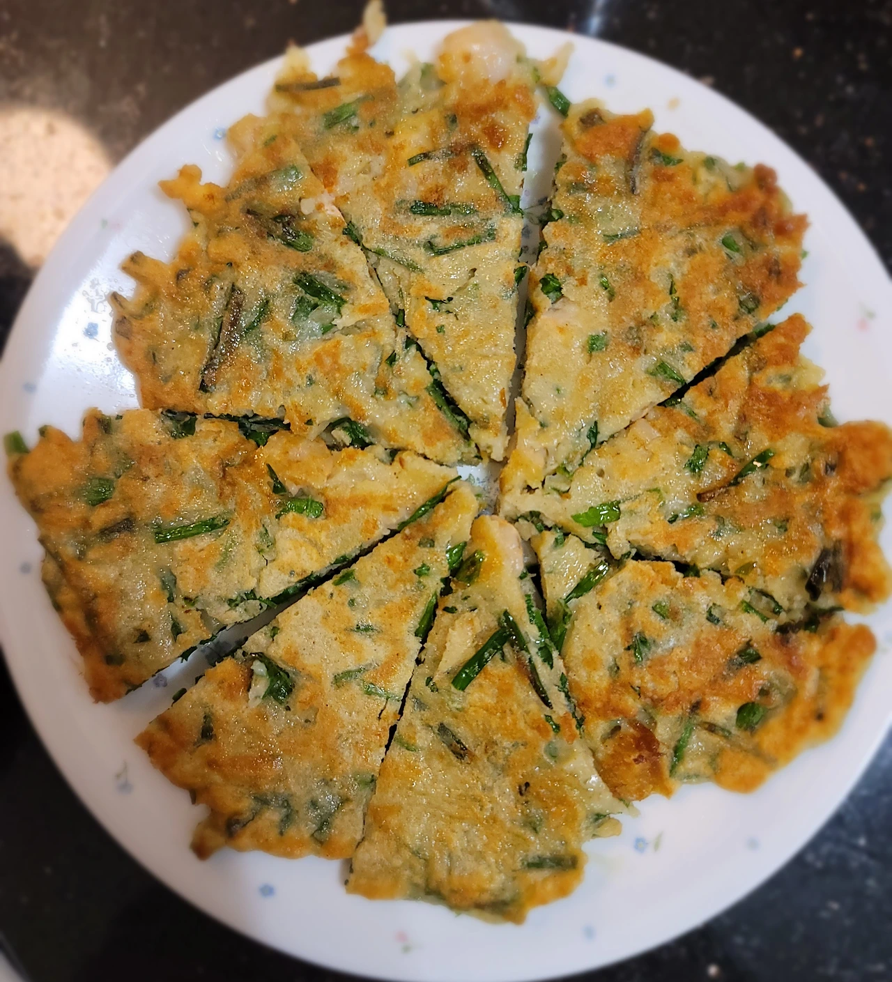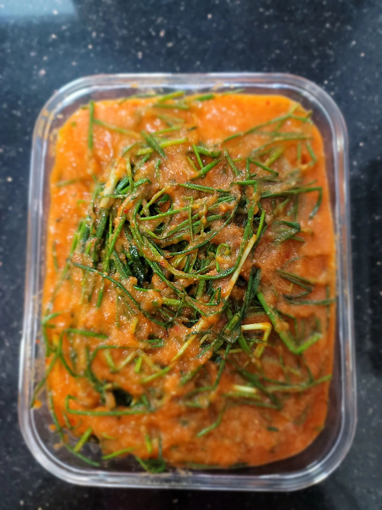 25g짜리 부추를 9개를 모으니 양이 꽤 되었다. 나는 너무 흐뭇했다. 부추를 깨끗이 씻고 요즘 설탕을 잘 안 넣어 요리를 하다 보니 김치에도 사과랑 배를 많이 갈아서 넣어 김치 양념을 만들었다. 배추김치처럼 오랜 시간 절이지 않아도 되니 부추김치는 생각보다 쉽다. 문제는 자주 해야 한다는 것이다. 설탕을 안 넣어도 배와 사과를 많이 갈아서 하니 단맛이 맛있게 나는 양념장이 만들어졌다. 이왕 한 김에 부추김치에 남은 부추에 해물을 넣어서 부추전도 만들어놨다.
