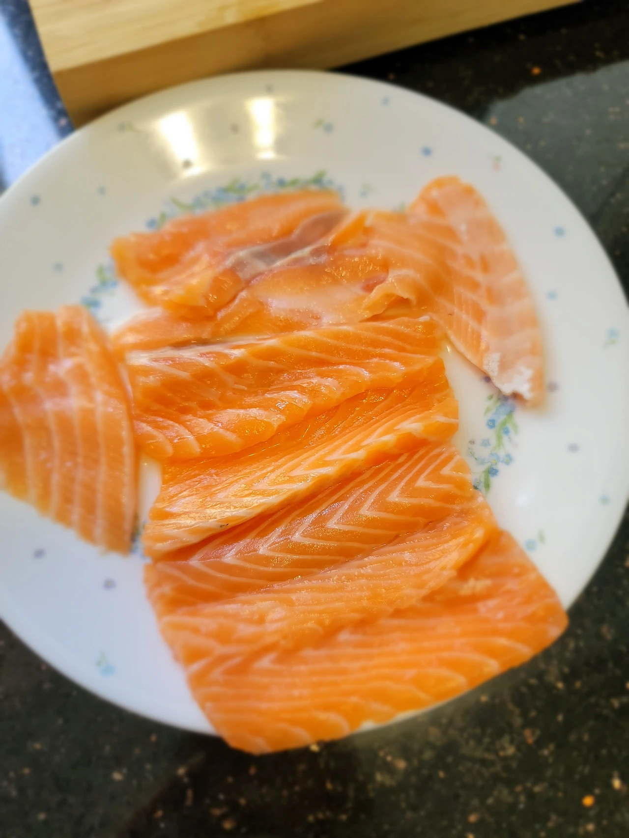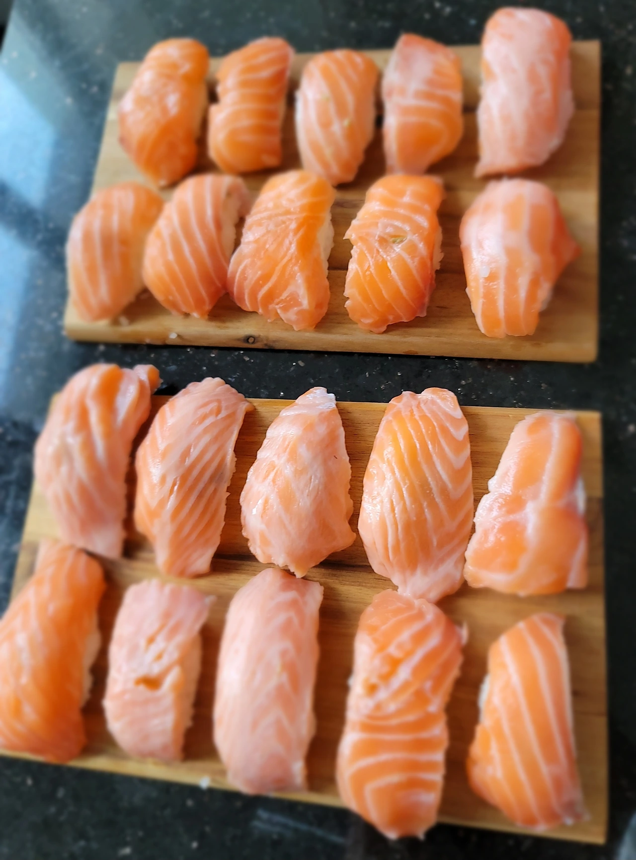 남편은 사전에 초밥에 대한 공부를 많이 했는지 법 연어를 크기에 맞춰 회를 뜨듯이 잘 손질해 나갔다. 그러면서 찬물로 자기 손을 씻어가며 연어초밥을 뚝딱 만들기 시작했다. 밥 간도 어찌나 딱 맞게 했는지 한입 양으로 만들어 고추냉이까지 겸비한 연어초밥을 만들었다.