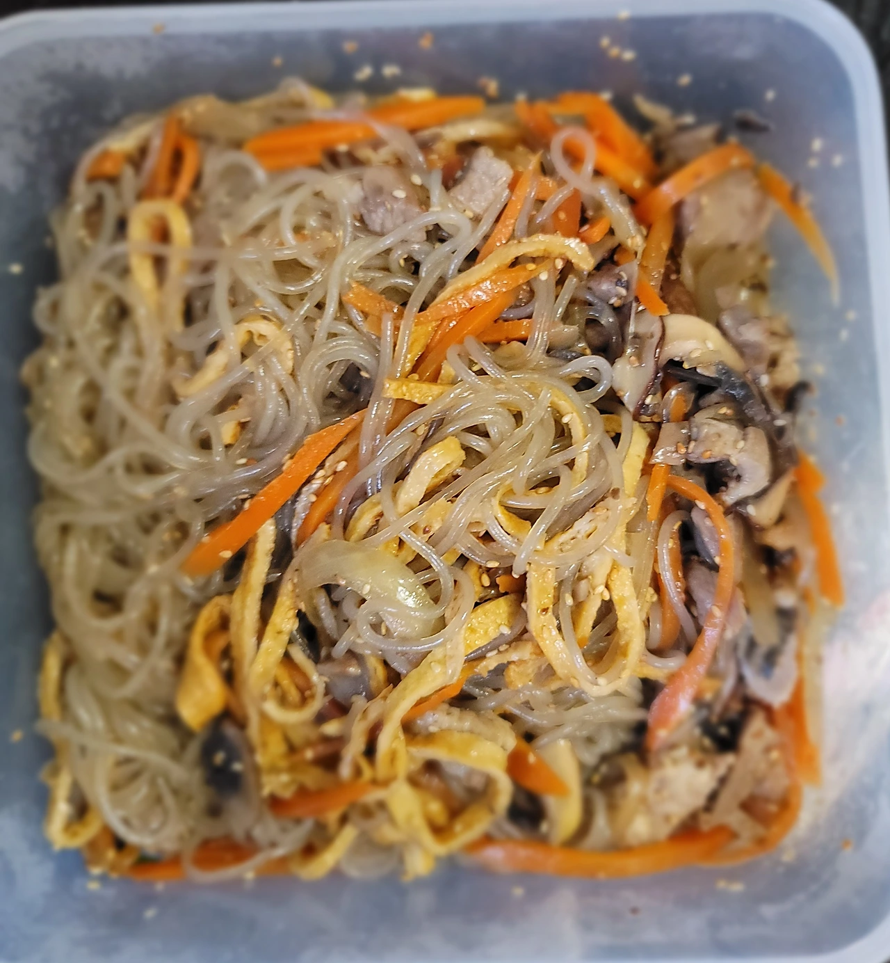 케이크까지 완성되고 얼른 잡채를 준비했다. 잡채는 워낙 많이 해주다 보니 나름 잡채에 고수가 되었다. 어묵도 길게 썰고 참기름 듬뿍 넣어 고소하고 맛있는 잡채가 완성되었다.