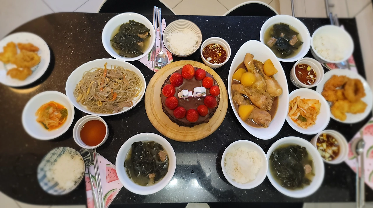 다행히 남편이 도착하기 전 모든 음식과 케이크가 만들어졌다. 출장으로 고생한 남편도 집안에서 풍기는 음식 냄새에 짐을 놓고 바로 손을 닦고 자리에 앉아 함께 생일파티 겸 저녁식사를 했다. 남편도 아이들도 너무 맛있다고 했다. 칭찬을 들으려고 가족을 위해 음식을 하는 건 아니지만 기분이 좋았다.