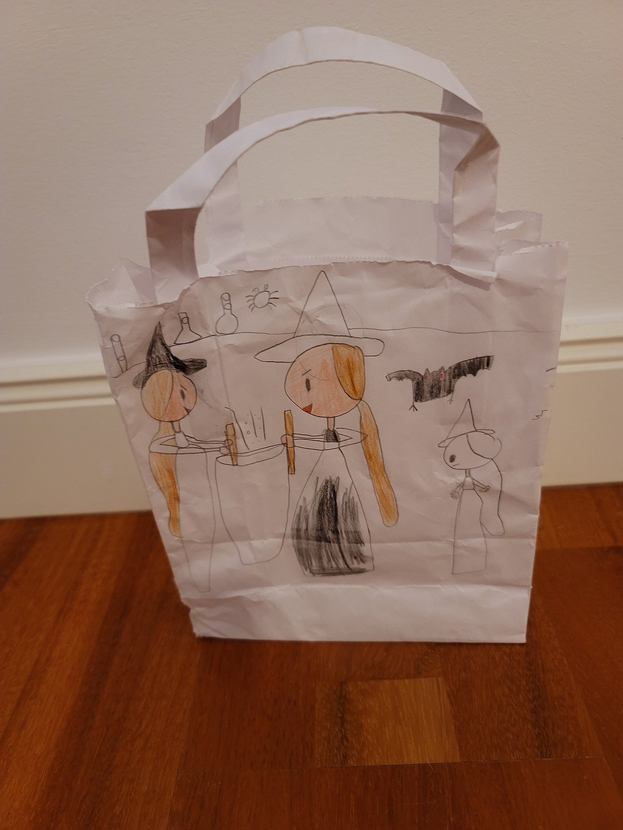 뒷날 아이들이 학교를 마치고 왔는데 결국 사탕바구니는 안 썼단다. 이번에는 화가 났다. 아니 갖고 오라고 했는데 왜 안 썼어?라고 하자 몰라. 다른 애들도 갖고 왔는데 사탕바구니를 안 썼단다. 둘째는 자기가 그린 가방이라며 보여줬다. 나는 아이들에게 우린 어젯밤 뭘 할 걸까?라고 이야기했다. 애들은 나중에 간식주머니나 써야겠다고 했다. 둘째는 자기 밤에 해리포터 옷을 입고 온 아이가 있다고 내년엔 자기는 해리포터로 준비를 해달란다. 우선 알았다고 했다. 올해 준비해놨으니 내년에는 이런 일이 없겠지라며 혼자 생각했다.