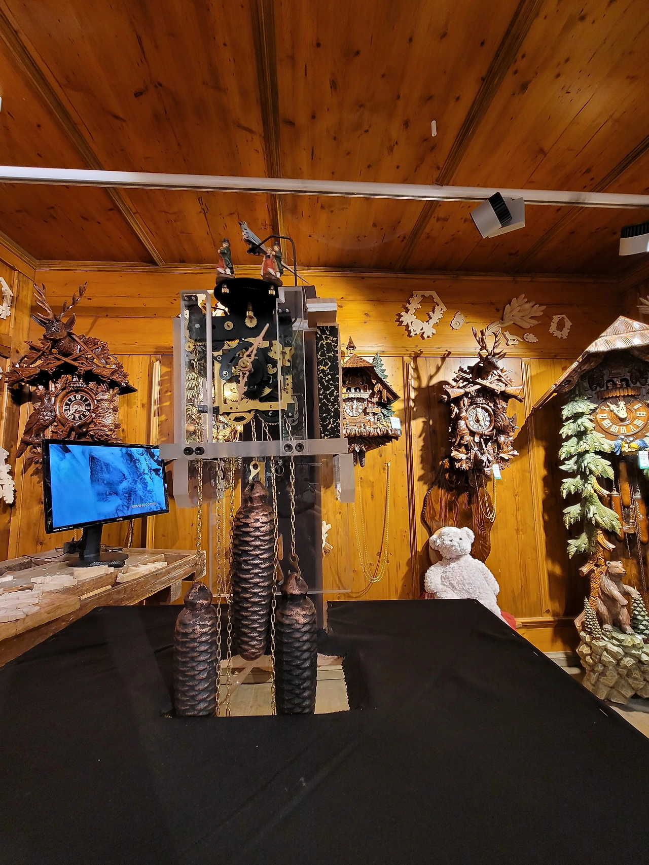 뻐꾸기시계를 만드는 작업장을 가게 한편에 전시해두었는데 이 솔방울 추가 시계가 가면 갈수록 아래로 내려가고 다 내려가면 다시 수동으로 위로 올려주면 된다. 그럼 건전지가 없이도 시계는 간다. 뻐꾸기의 소리는 참 예뻤다. 정각에는 시간에 맞춰 뻐꾸기가 울리고 30분에는 한 번만 울린다.