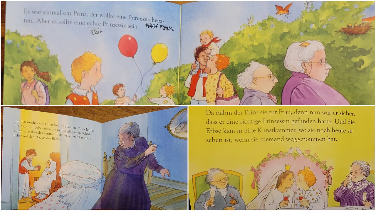 나는 둘째가 학교를 간 사이 모르는 독일어 단어를 찾아 발음을 들어보고 내용을 습득해놨다. 동화책의 내용인즉슨 진짜 완두콩으로 진짜 공주를 찾는다는 내용이었다. 10장밖에 안 되는 책이었지만 내용을 파악하고 모르는 단어는 발음 연습을 하고 내 나름의 도전이었다.