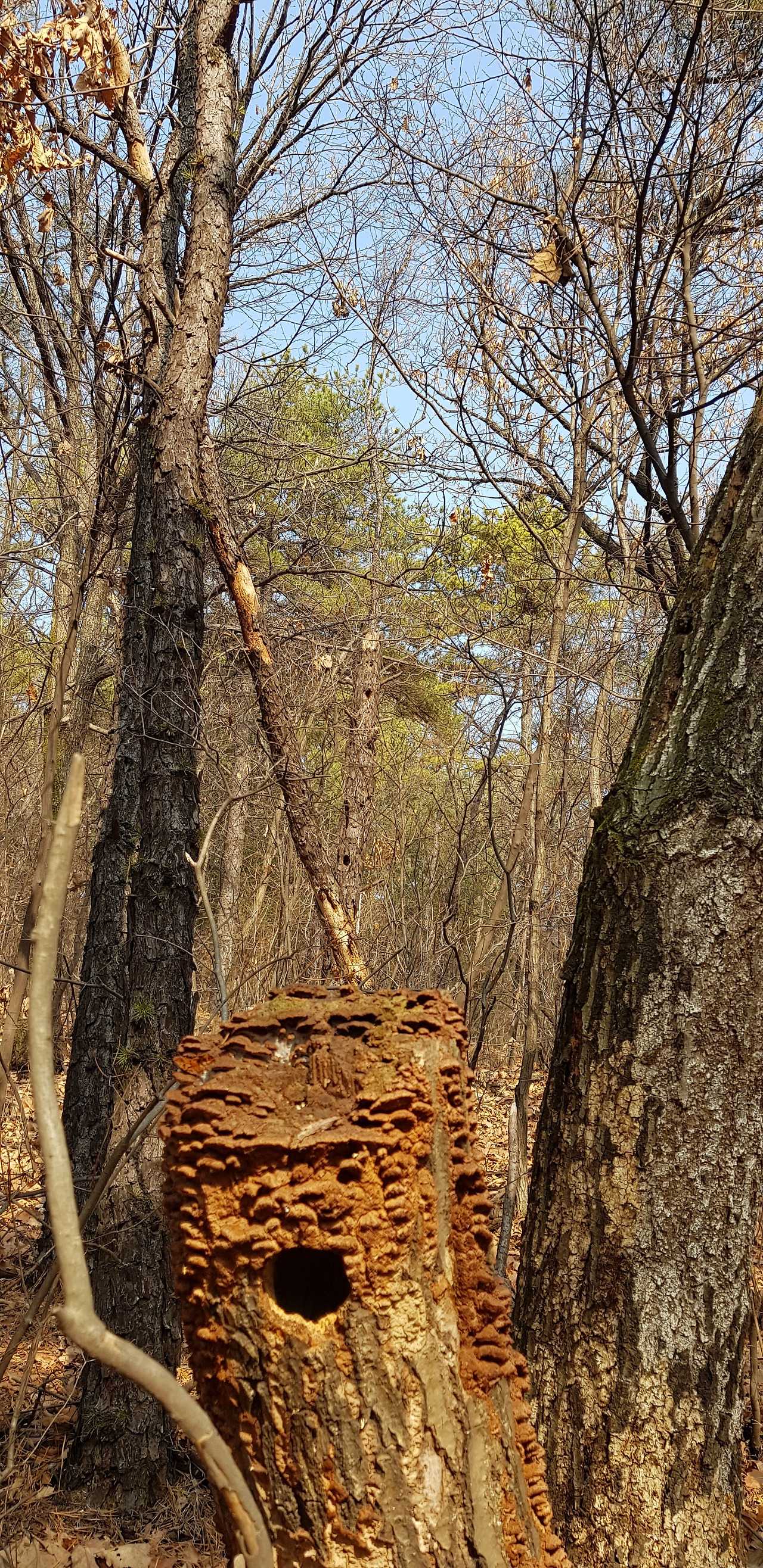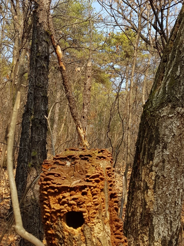 흙길은 녹아서 산새 발자국이 찍혔다. 허리를 펴고 오름길을 보니, 양쪽으로 늘어선 나무의 원근이 조화롭다. 아직 새잎이 달리진 않았어도 폭신한 느낌이 든다. 뾰족한 바늘끝 같은 솔잎도 봄기운이 들었는지 보드라워 보였다. 지난 계절 무수히 밟혔을 떡갈나무 잎은 밟혀도 더 이상 바스락 소리를 내지 않는다. 흙으로 돌아가기 위해 이미 제 몸의 뼈를 다 녹였나 보다. 양분을 먹은 봄산의 숨소리. 작년에 벤 나무인가. 동면에 든 나무더미 속에선 버섯 포자가 눈 녹은 물로 숨을 쉬리라. 파릇하게 이끼가 올라와 앉았다. 온몸으로 느낀 포근한 봄의 감촉.