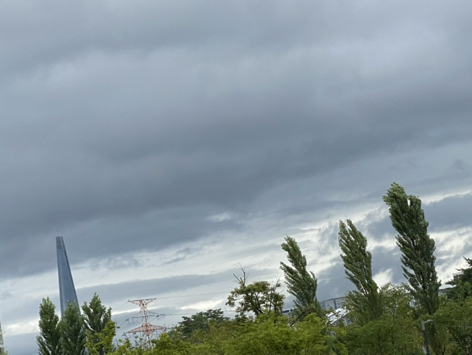 빠르게 지나는 구름들 사이에 롯데 타워가 불뚝 서 있다. 사진을 한 장 찍으려고 각도에 정성을 들이는데 로코가 줄을 잡아당겨서 폰이 바닥에 떨어져서 액정 필름에 금이 갔다.