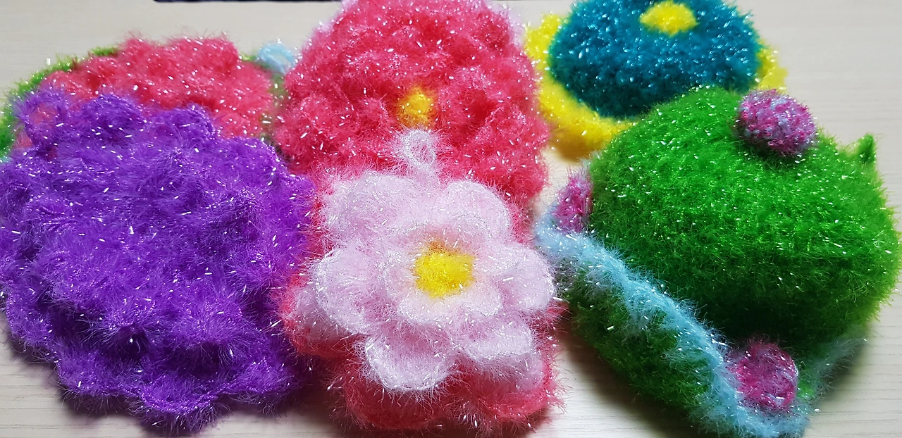 수세미에 세제를 한번 떨어뜨리고 문지르면 뜨개 수세미는 하얗고 몽실몽실한 거품을 만들어낸다. 뜨개실 사이사이의 공간이 오히려 거품을 더 많이 만들어내게 한다. 엄마가 짜주신 촘촘한 수세미는 공기층이 더 많이 생기면서 적은 세제 양으로도 거품이 잘 나는 것 같다. 특히 광택이 있으면서 가는 실은 코바늘과 만나면 세상 가볍고 폭신한 엄마표 수세미가 된다.