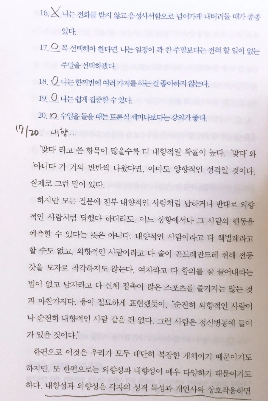 사회 발생적 근원을 살펴보고 외향 성격에 가깝다고 생각했다. 하지만 사회생활을 시작하면서부터 업무 공간은 나에게 스트레스 발생지였다. 혼자만의 시간이 없이 육아와 직장 업무로 답답했고 미칠 지경이었다. 혼자 다양한 생각에 집중하고, 정리하는 나만의 루틴이 필요했다. 그렇지만 이어폰을 귀에 꼽고 게임 네트워크 세상으로 접속했다. 무언가 생각하는 것마저도 하기 싫었고, 점점 무기력해졌다. 가끔 만나는 사람들과 어울리기도 했지만, 주변이 시끌벅적한 카페와 레스토랑, 음식점에서 상대방에 전혀 집중할 수 없어 오히려 스트레스가 더 쌓였다. 업무로 만나는 관계가 아니라면 친근하게 다가갈 수 있어서 외향이라고 생각했지만, 본격적으로 사회생활을 하면서 내향성이 강하다고 확신했다.