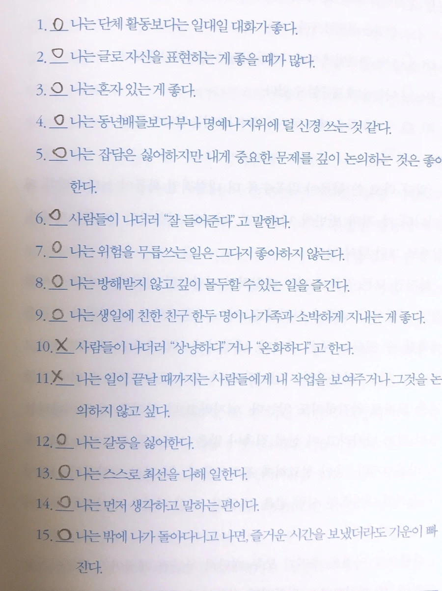부모님, 특히 아버지는 가부장제의 최대 피해자로 남자는 대담해야 하고, 남들과 거리낌 없이 지내야 한다고 말씀하셨다. 그래야 세상을 잘 살아가는 멋진 남자라고 전형적인 외향 마인드를 가지신 분이셨다. 이러한 편견은 인간이 15만 년 동안 진화해오며 생겨난 한 가지 성격을 무시하는 행동이다. 외향형 성격이 우수하다는 편견으로 말미암아 우리는 자신이 누구인지 알지 못하는지도 모른다.