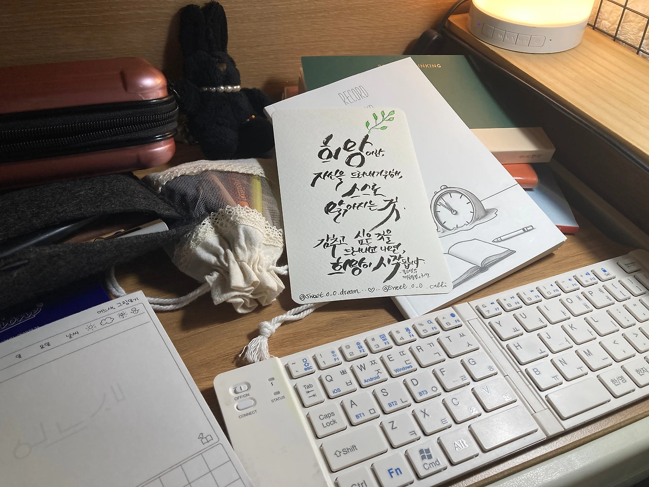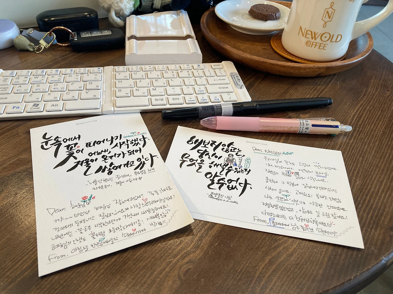 그래도 나는 블루투스 키보드의 편리함에 감사하며 열심히 글을 쓰는 한편, 나의 아날로그 감성을 잃지 않기 위해 펜을 놓지 않는다. 요즘은 필사와 캘리그라피로 그 마음을 이어가고 있다.