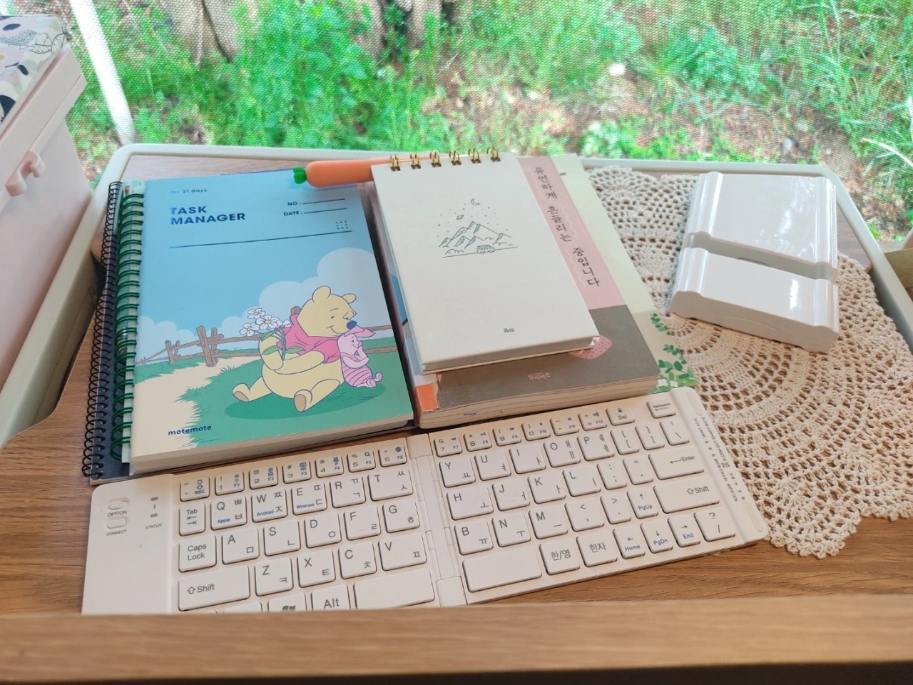 그것은 바로 ‘블루투스 키보드’를 만난 시점부터 이다. 한 2017년 즈음으로 기억한다. 매일같이 봇짐을 바리바리 지고 다니던 내게 (다이어리, 노트, 펜꾸러미 등등 가끔은 노트북까지.) 함께 교육을 받던 언니 한분이 달랑 웬 부채 같은 길쭉한 것을 하나 꺼내는 것이 아닌가?