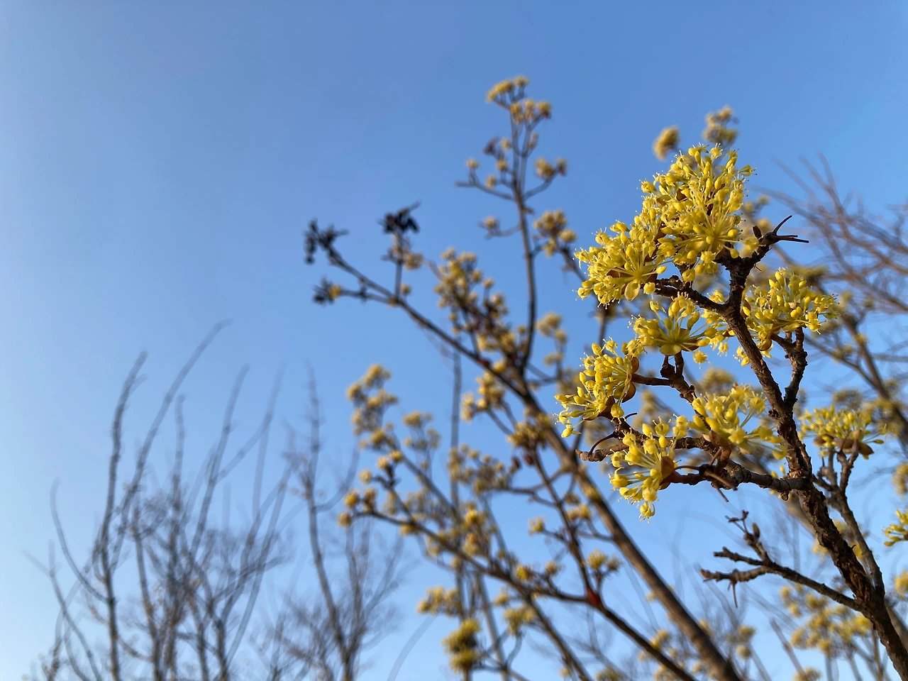 쾌청히 파아란 하늘에 산뜻하게 노오란 산수유.