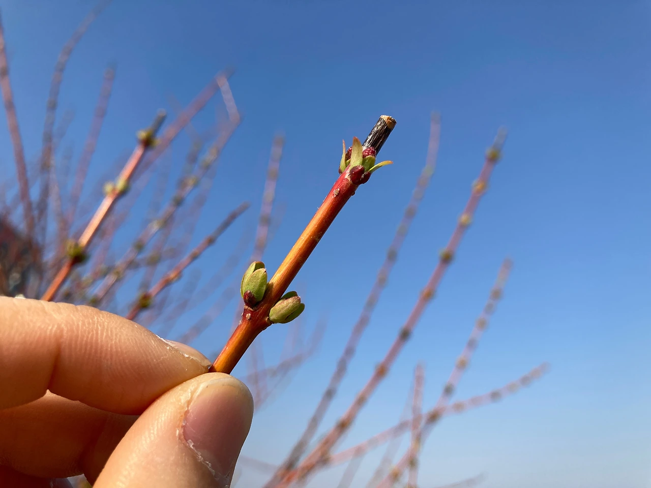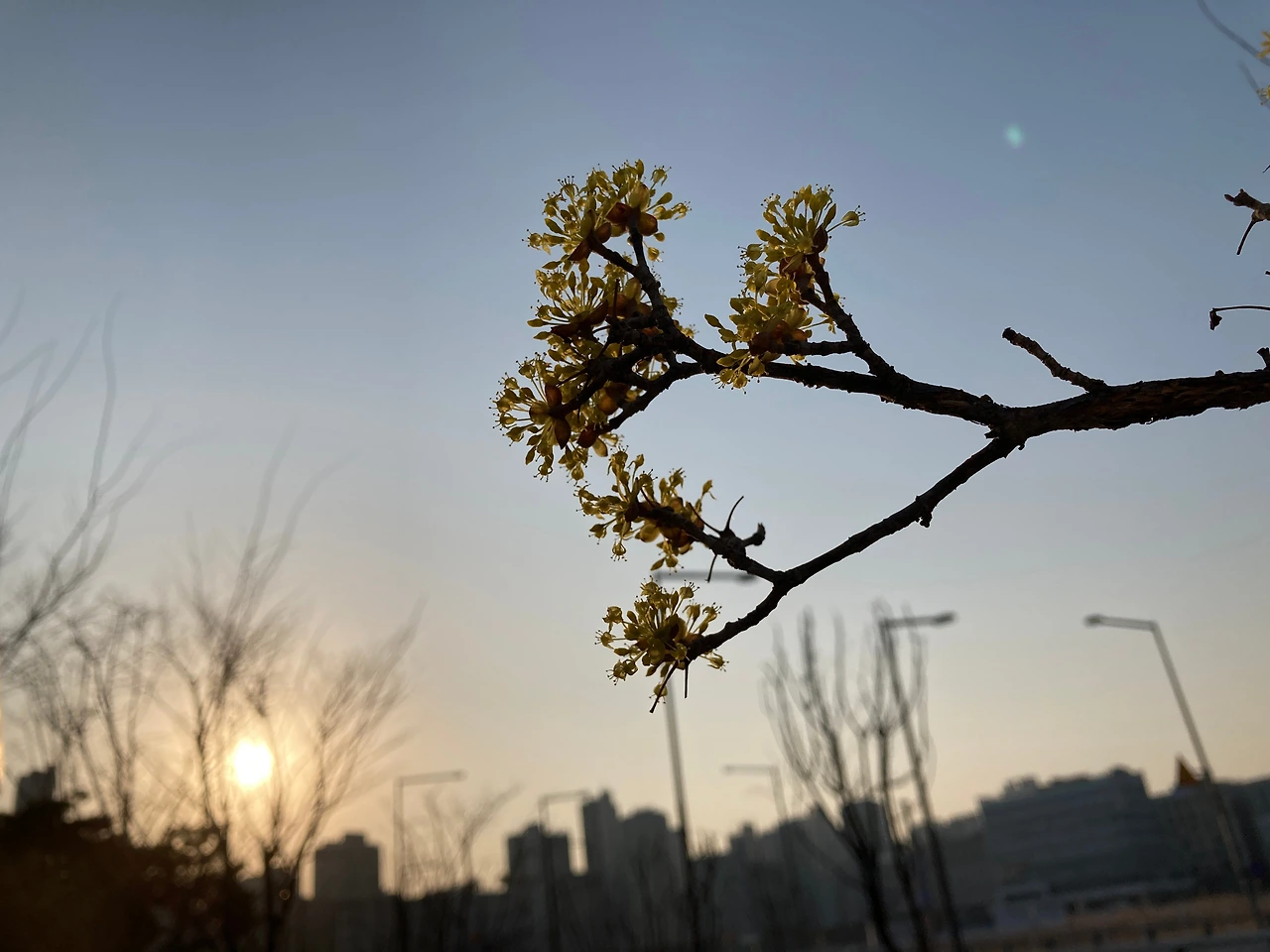 노을빛 어슴푸레한 하늘에 함께 아련해지는 산수유.