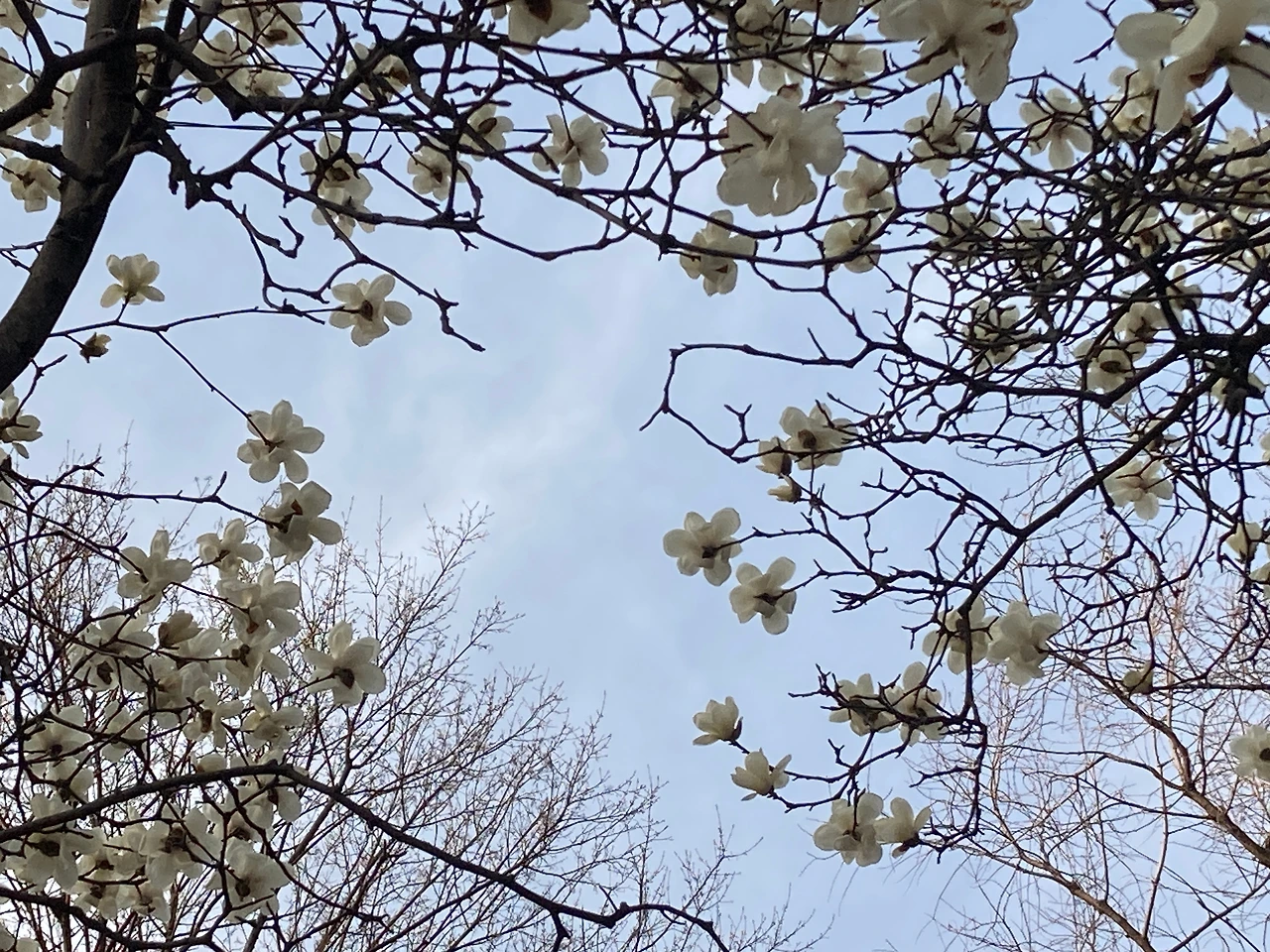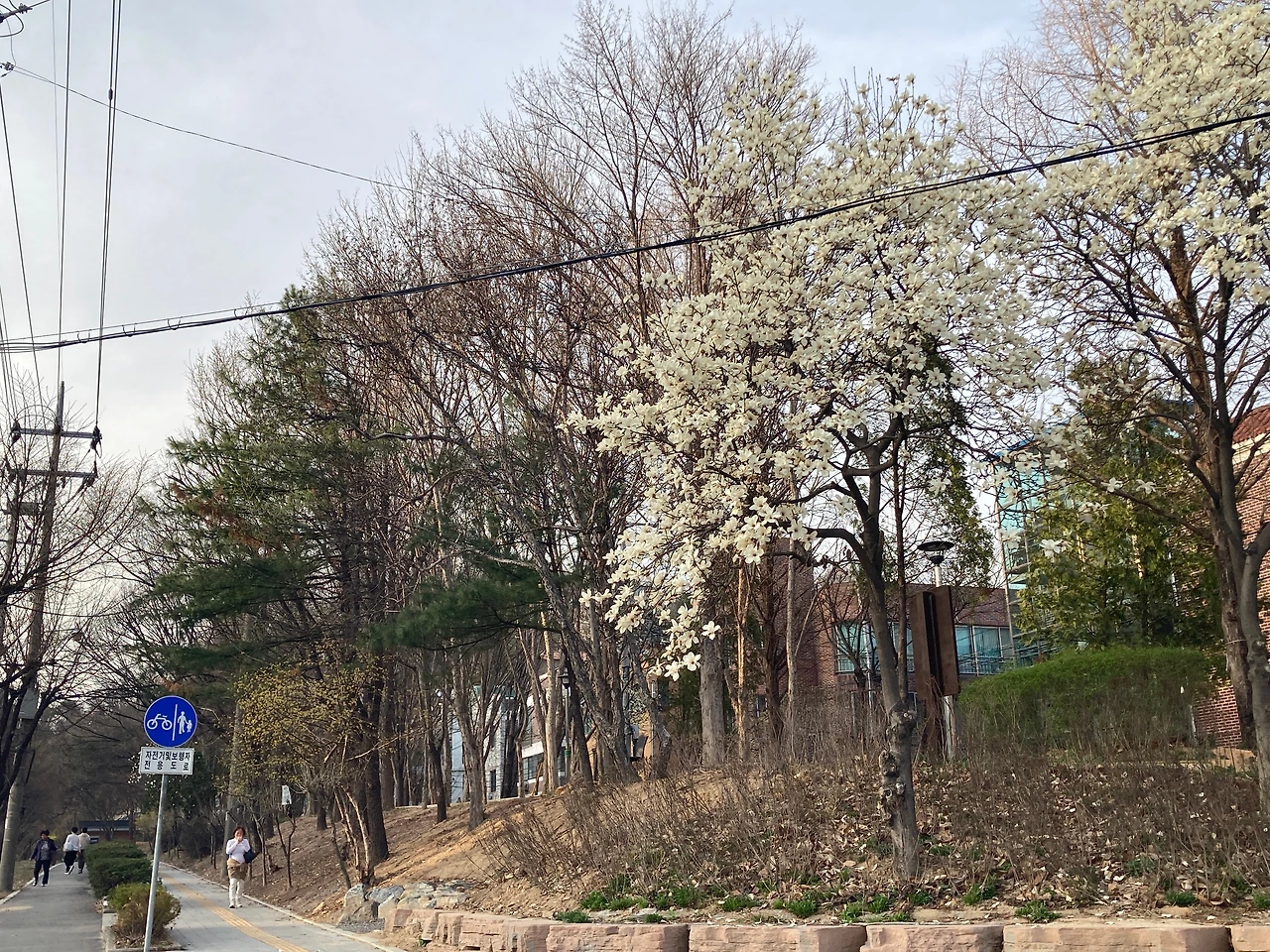 집으로 돌아가는 길에 잠시 또 다른 친구에게도 챙겨 온 빵을 전해주고 가려고 다른 경로로 가고 있었다. 잠깐 전화를 해야 하는 상황에 멈추느라 길을 잘못 들었는데, 그 바람에 마침 어린 시절 엄마와 살던 동네를 지나야 했다. 아무 생각 없이 지나가다가 문득 저 멀리 예전 집 앞의 동산에 새하얗게 핀 목련나무가 보였다. 나는 곧바로 차선을 바꿨다. 예전 집 앞에 차를 대고 집 앞동산 산책길로 올라갔다.