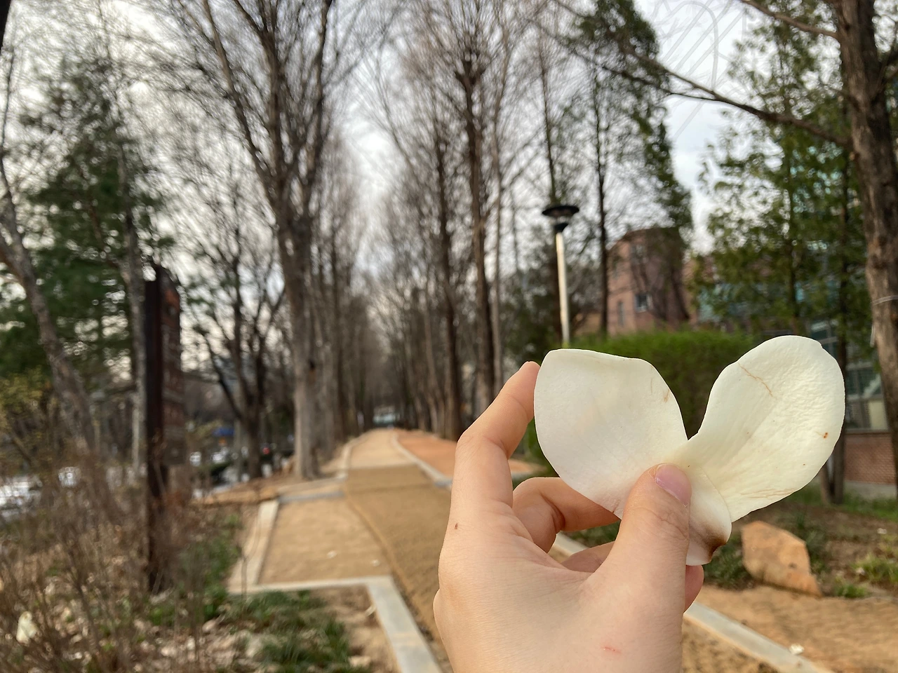 추억에 젖어 목련 꽃잎을 들고 엄마와 예전에 하던 것처럼 목련 풍선을 불었다.