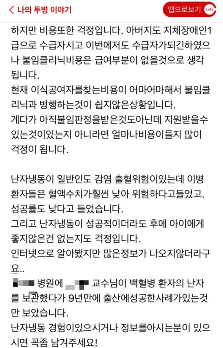 먼저, 주기적인 수혈과 여러 검사와 함께 치료를 언제 시작할지 모르기에 이식 공여자를 찾아 놓기 위한 과정이 가장 먼저 시작되었다. 그중에서도 제일 먼저였던, 오빠의 검사결과는 반일치. 그 당시 반일치 이식이 시작된 지 5년밖에 되지 않아 그보다는 안정적인 이식을 위해 100% 일치차를 찾는 과정을 시작해야 한다고 했다. 한국 조혈모세포이식 협회에 조회를 해 봐야 알고, 나온 사람들이 몇 명이냐에 따라, 또한 이식 의사를 묻고 답변에 따라, 검사를 진행하고 또 100% 일치자가 없으면 다음 그룹으로 같은 과정을 반복해야 한다고 했다. 언제 찾아낼 수 있을지도 모르는 상황도 힘들었지만, 그 과정 한 단계 한 단계마다 드는 비용에 눈앞이 캄캄해졌다. 이 비용은 보험처리가 불가하기에 온전히 다 현금으로 부담해야 했다. 일치자를 찾아낼 수 있을지도, 찾는다고 해줄지도 알 수 없는 희미한 가능성에 희망을 걸고. 돈이 없다고 검사를 하지 않겠다고 하여 반일치이식으로 바로 하는 것도 불가능하다고 했다. 그렇게, 오빠의 100% 일치가 아니라는 검사 결과와 조혈모세포이식에 대한 밑 낯의 설명을 듣는 날, 가장 큰 힘겨움도 알게 되었다. 아이를 가질 수 없다.