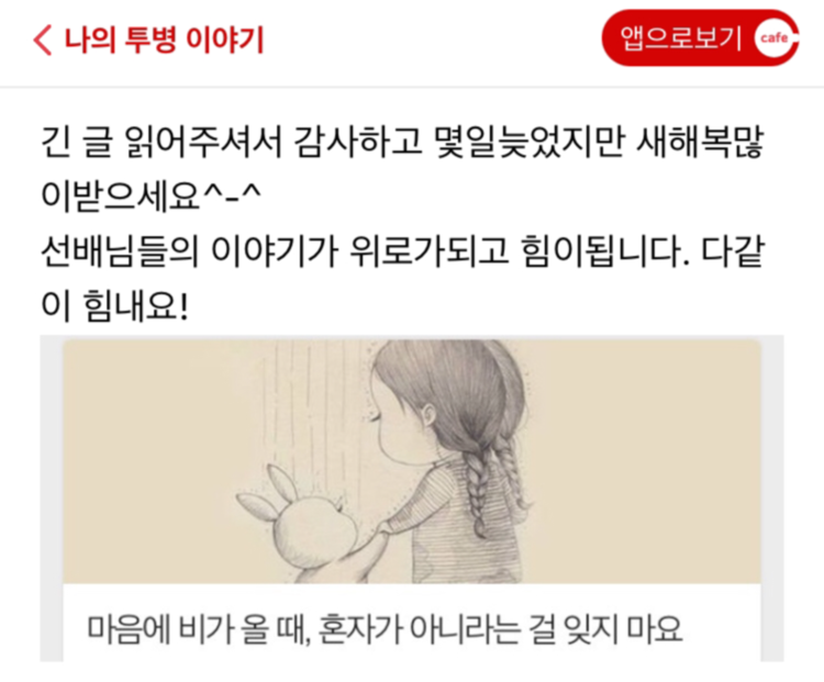 언니와 나는 10년 전 혈액암 환우회 카페에서 처음 알게 되었다. 13년 전 혈액 이상 의심으로 추적 관찰을 하던 나는, 난생처음 들어보는 희귀한 병명에 인터넷 검색을 해보고는 그저 아닐 거라 믿으며 3년의 시간을 모른 척 지냈었다. 점차 잇몸 출혈이 잦아지며 마음의 준비를 했고, 병이 확진되었을 때, 가장 먼저 환우카페를 방문했다. 모른 척 지내던 시간에, 나의 그는 환우카페에 이미 가입을 해 놓았던 것이다. 그는 확진이 되자마자, 링크를 보내주었고 그의 아이디로 많은 글들을 보았다.