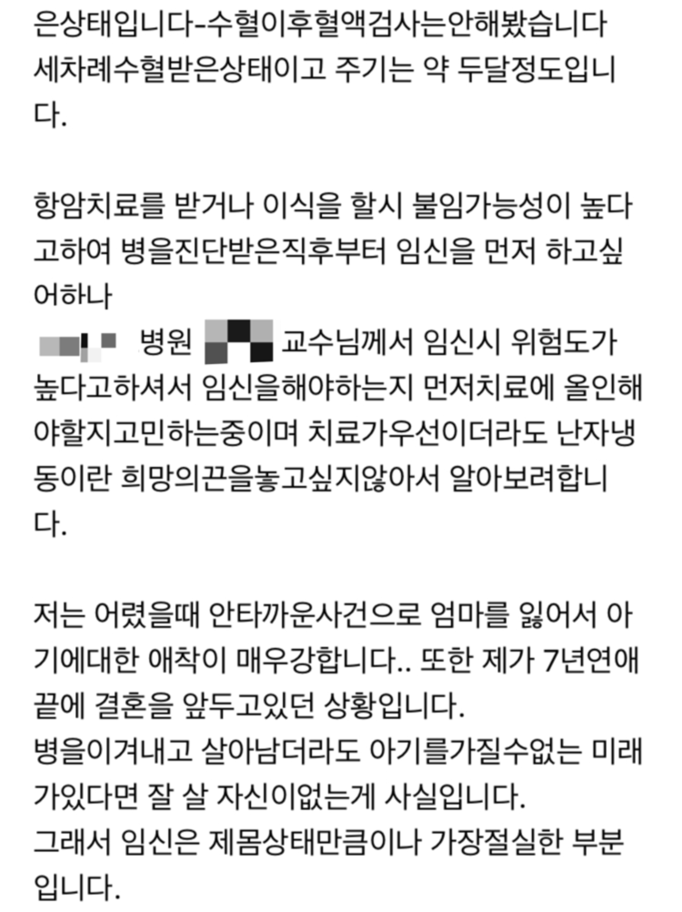 이런 마음을 가진 채, 이 모든 마음을 담아 카페에 첫 글을 썼다. 결혼을 앞두고 이런 상황이 펼쳐져 이러지도 저리지도 못하는 현실이 힘들다고. 혹시 난자냉동시술을 한 환우분들이 있느냐고. 글을 쓰기 전에 검색을 통해 찾아낸 정보는, 대부분 목숨을 걸고 그렇게 도전하지 않는다는 글, 그럴 시간조차 없이 상태가 악화되어 이식에 들어간다는 글, 오히려 이식 전 아이를 나았다는 케이스가 있다는 정도였다. 이 모든 슬프고 살얼음판 같은 상황의 케이스에 마음이 아프면서도, 도저히 불임이 받아들여지지 않는 나의 사연들과 함께 글을 적어나갔다. 나의 간절한 글에, 비슷한 상황과 마음 가진 사람 몇몇이 공감과 위로의 댓글을 달아주었다. 그 진심 어린 댓글 속에, 나의 ‘여름’, 나의’ 중지‘ 언니가 있었다.