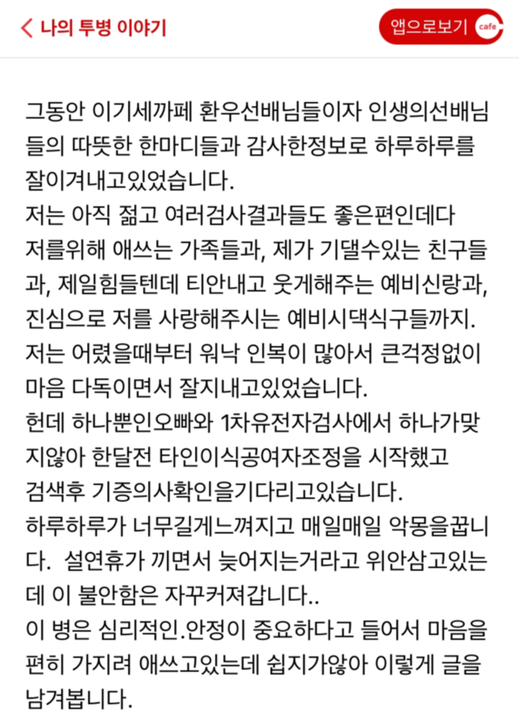 3달가량 경과를 관찰하며 희미한 희망에 큰돈과 좀먹어가는 마음을 내어주고 있었다. 검사를 해 볼 수 있는 등록자는 16명이라고 했다. 그렇지만 그렇게 또 옅은 희망을 걸고 기다린 그 끝에는 16명 모두가 이식을 거부했다는 연락이 돌아왔다. 교수님은 오빠와의 반일치 이식을 할 수 있다고 했지만 생존율이 확인할 수 있는 것이 아직 5년뿐이니 쉽게 이식을 시작하자는 말씀을 할 수 없었다. 생각보다 나의 치료 진행은 느렸고, 기다림의 시간이 길어졌다. 병의 진행이 느린 것이 다행이라 생각 드는가? 아이러니하게도, 오히려 반대였다. 미래를 꿈꿀 수도 없고, 일을 할 수도 없고, 현재에 당장 치료를 시작할 수도 없는 그저 죽어가기를 기다리는 지옥 속에 있었다. 결국 죽음을 향해 가야만 치료를 시작할 수 있다는 현실이 슬펐고, 치료를 한다해도 내 평생 유일한 꿈이었던 ‘엄마와 딸’의 관계를 내 아이와 이을 수 없을지도 모른다는 사실이 다가오는 죽음보다 두려웠다.
