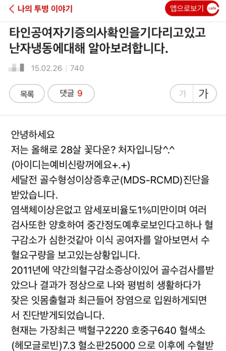 나의 병명은 ‘골수형성이상증후군’ MDS라고 불리는 혈액암의 일종이었다. 처음 인터넷 검색으로 병을 접했을 때, 막연한 두려움으로 다가왔던 확률에 반해, 진짜 그 시간을 겪어가고 있는 수많은 이들의 경험담이, 아니, 실시간으로 뜨는 그들의 현실이 무서우면서도 안심이 되었다. 처음에는 많이 무서웠지만, 이내 현실을 받아들이고 막연히 무서워하기보다는 실체를 바로 보기 시작했다. 그 순간부터 내가 해야 할 것들이 선명해졌다. 많은 분들을 통해 미리 배워놓을 수 있었던 정보들이 가득했고, 그 덕분에 나의 서울행은 순조로웠다. 혈액암 중에서도 나의 병만을 전담진료하는 국내 유일의 교수님을 찾아갈 수 있었고, 앞으로의 치료가 어떻게 진행될지 예상하고, 찾아올지 모를 돌발상황에도 대처 방법을 미리 배워 놓을 수 있었다.