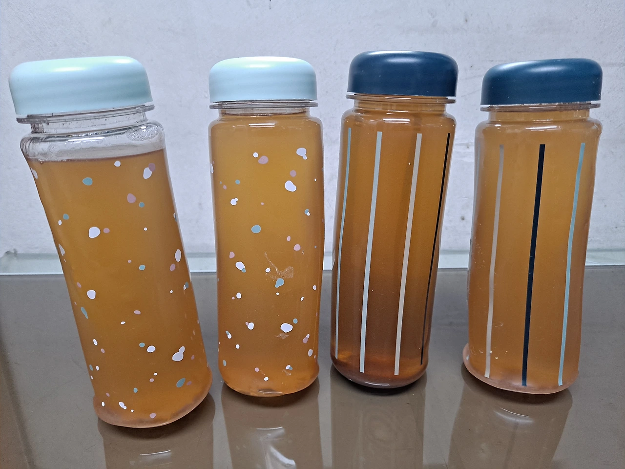 다시 뜨거운 물을 붓고 손으로 꽉 눌러 최소한 넘어지지 않는 병을 만들었다. 뉴디자인 물병의 탄생.