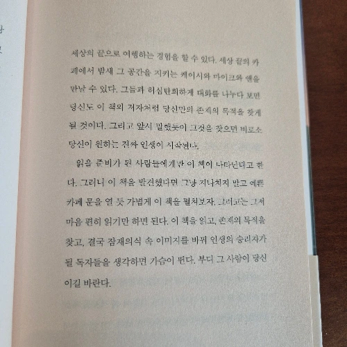 그러니 이 책을 발견했다면 그냥 지나치지 말고 예쁜 카페 문을 열 듯 가볍게 이 책을 펼쳐보자.