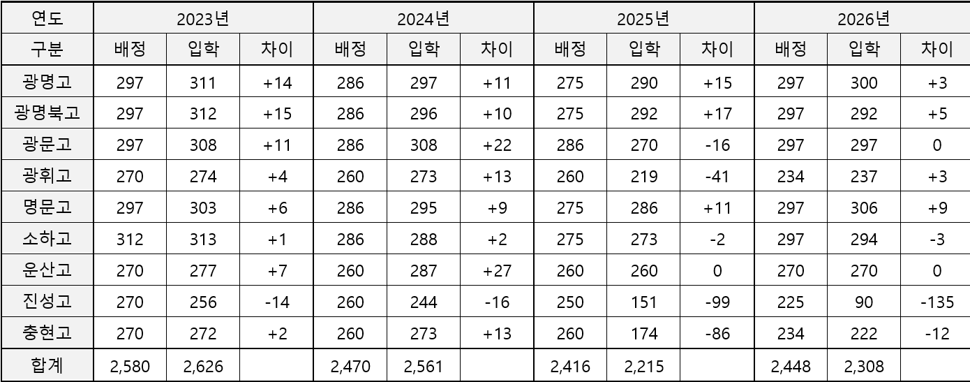 아래 표는 광명시 9개 고등학교의 실제 배정인원·입학생 수(2023~2026)를 정리한 것입니다.