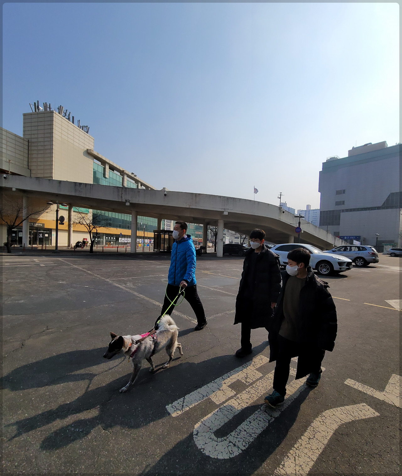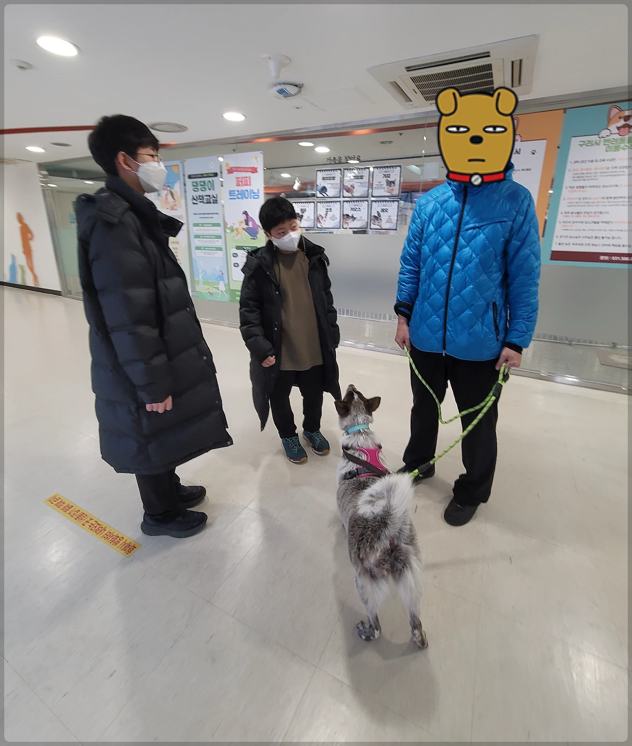 ※ 레오와 산책 나가기 바로 직전 모습. 센터 앞 복도에서 다시 한번 간단한 산책 주의사항을 들으며 마음을 다잡고 있던 우리 가족이에요. 처음 해보는 산책에 잔뜩 긴장해서 차렷 자세로 서 있던 우리. 그리고 그런 우리를 바라보며 '당신들이 나를 산책시켜 줄 건가요?'라는 듯 서 있는 레오.