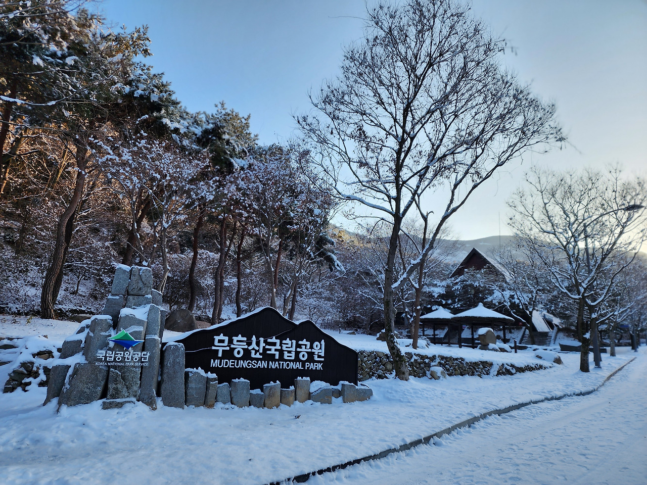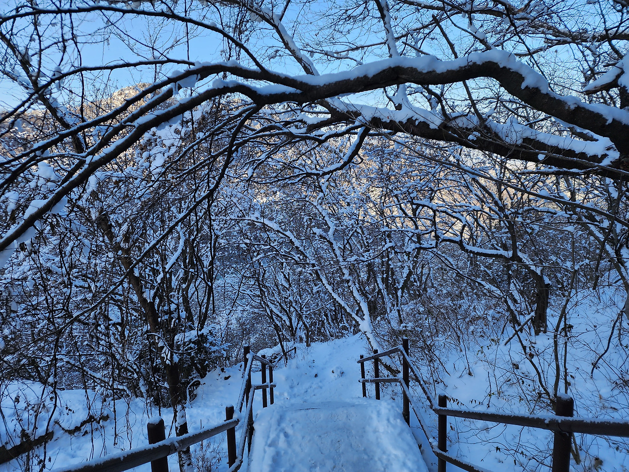 등산로 입구는 썰렁했다. 가게들의 문은 아직 닫혀있었고 오가는 사람도 거의 없었다. 8시가 조금 넘은 시간인데 월요일이라 그런지 등산객은 전혀 보이지 않았다. 눈이 와서 눈꽃 산행할 사람이 좀 있으리란 생각은 빗나갔다. 공기는 찼으나 날씨는 쾌청했고 바람도 없었다. 눈이 내리면 더 운치는 있겠지만 산행에는 불편하다. 눈 온 뒤 이런 맑은 날이 겨울산행에는 최적이다. 가자.