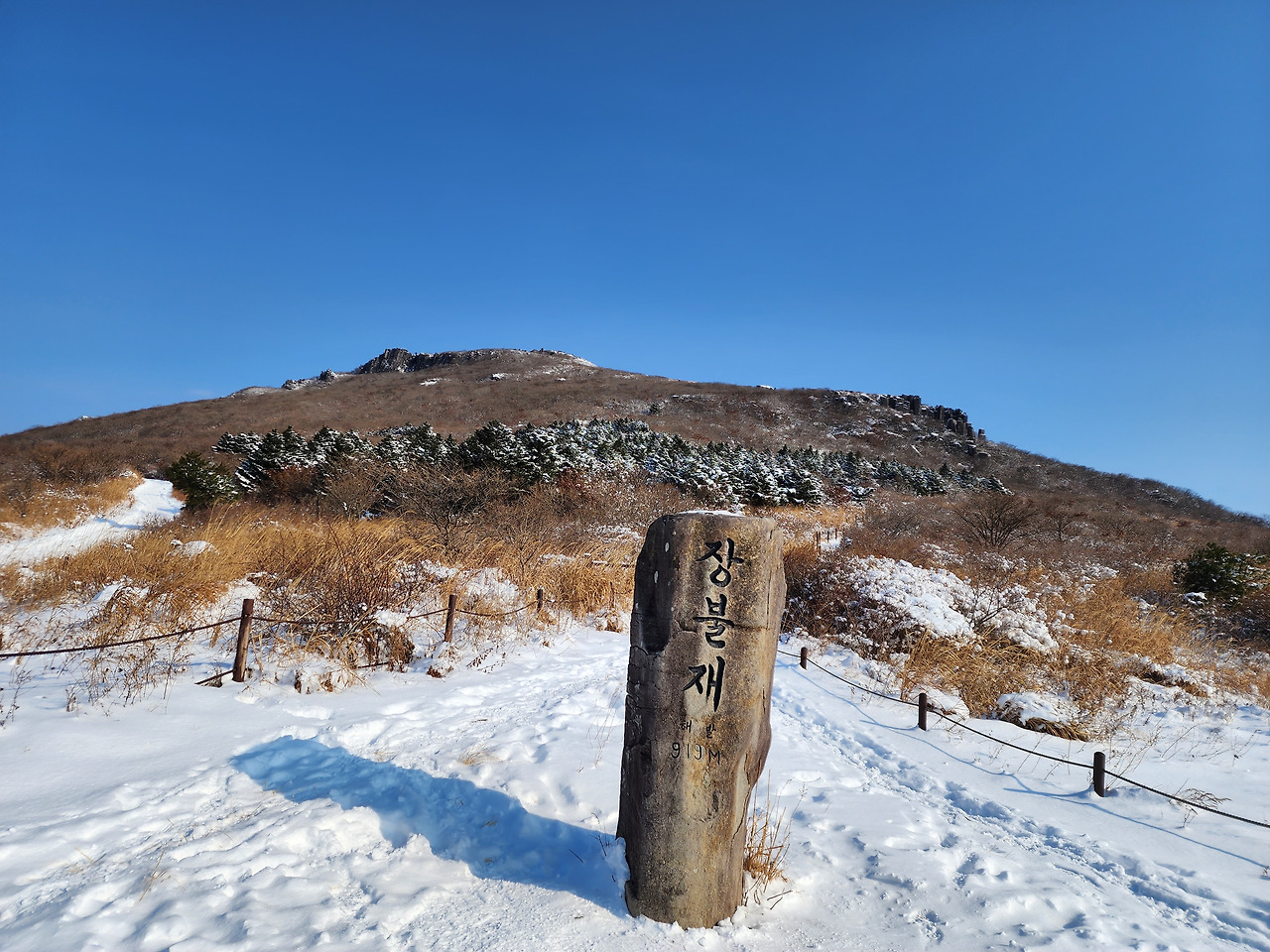 중머리재에서 한 시간쯤 걸려 장불재에 도착했다. 높이가 800미터에 이르니 바람 없이 햇볕이 잘 드는 곳에서도 아래보다는 추웠다. 안에서는 조금씩 땀이 나기 시작했고 몸 밖에는 추위가 에워싸고 있었다. 이게 겨울 산행이다. 오래 쉬면 추위가 몸 안으로 엄습한다. 지도를 보니 정상까지 남은 코스는 1km가 안된다. 그런데 안내판의 코스 색깔이 검붉은 색이다. 코스가 더 험하다는 의미다. 대부분의 산에서 마주하는 마지막 경사구간이다. 살면서 무언가 목표를 이루기 위해서는 마지막에 좀 더 험한 고비를 넘어야 제대로 된 성취를 맛보게 되는 것을 매번 산행에서 되풀이하는 것 같다.