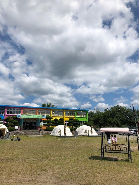 기대를 머금고 도착한 캠핑장은 하얗고 예뻤다. 넓은 잔디밭에는 아이들이 즐겁게 뛰놀고 천막 사이로 여유를 즐기는 사람들이 보였다. 반짝이듯 잔잔한 분위기가 좋았다. 숙소 바로 앞에는 작은 풀장이 마련되어 있어 개구쟁이처럼 물을 뿌리고 놀았다. 줄지어 있는 동그란 돔 모양의 숙소를 보고 있자니 방학이면 학교에 모여 캠핑하던 어린 시절이 생각나 신나는 입꼬리를 감출 수 없었다.