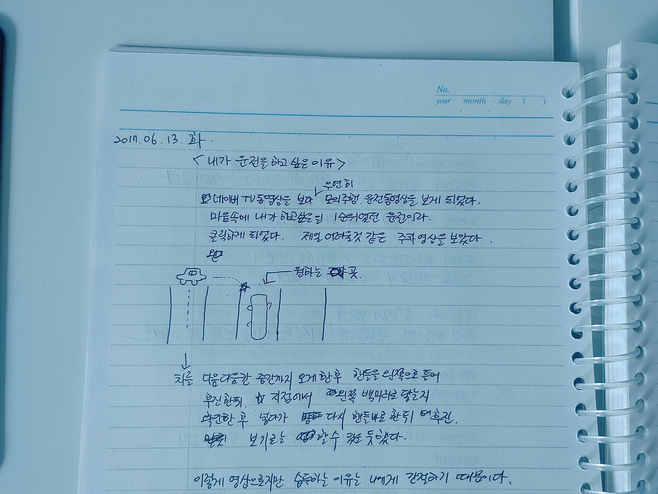 3주 전쯤이었을까. 신랑은 차를 구입했다. 그리고 신랑이 타던 차는 자연스레 내 차가 되었다. 내 것, 사적인 이동수단이 생겼다는 건 내게 경사에 가까웠다. 운전에 대한 내 갈망은 깊었다. 12년 면허를 취득했지만 자격은 장롱 깊숙이 들어갔다. 운전에 대한 욕망은 꺼지지 않는 불씨였다. 일기장에 내가 운전을 하고 싶은 이유를 적어 놓았고, 주차하는 그림을 그려 놓기도 했다.
