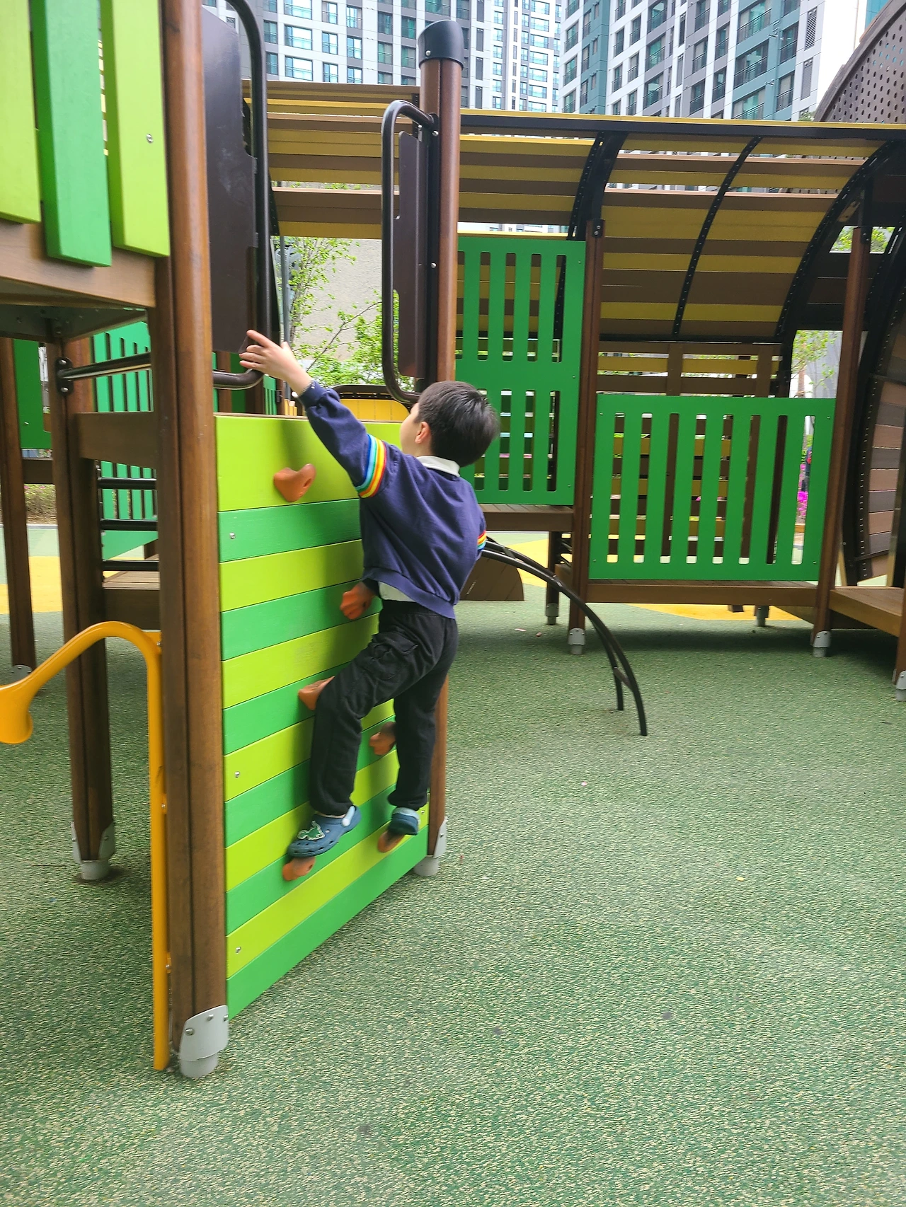 태권도 시간을 바꾸니 놀이터에서 놀 수 있는 시간이 많아졌다. 한 시간을 놀아도 밝아서 집에가는 길에 놀이터마다 들러서 놀곤 한다. 다만 시간을 바꾸니 놀이터에서 만나던 친구들을 못 만난다. 원래 태권도 끝나고 여럿 모여서 놀았는데 같은 유치원 친구들이 없어 오르락 내리락 미끄럼틀만 탄다.