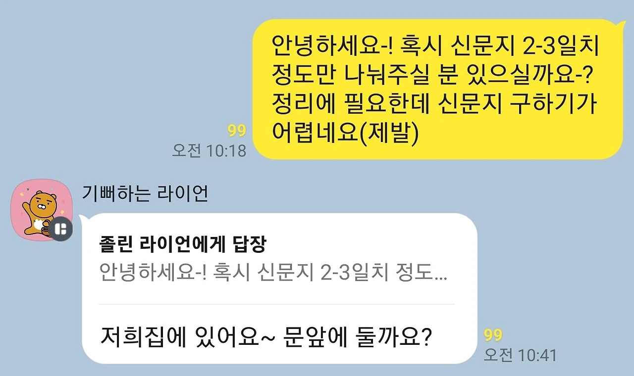 동네에서 신문을 구할 수 있을까 해서 맘톡에 올려봤다. 30분도 안 되어 주신다는 분이 나타났다. 지난 번에도 느꼈지만 감사한 세상이다. 쇼핑백에 과자와 사탕 등을 넣고 신문지를 받으러 갔다.